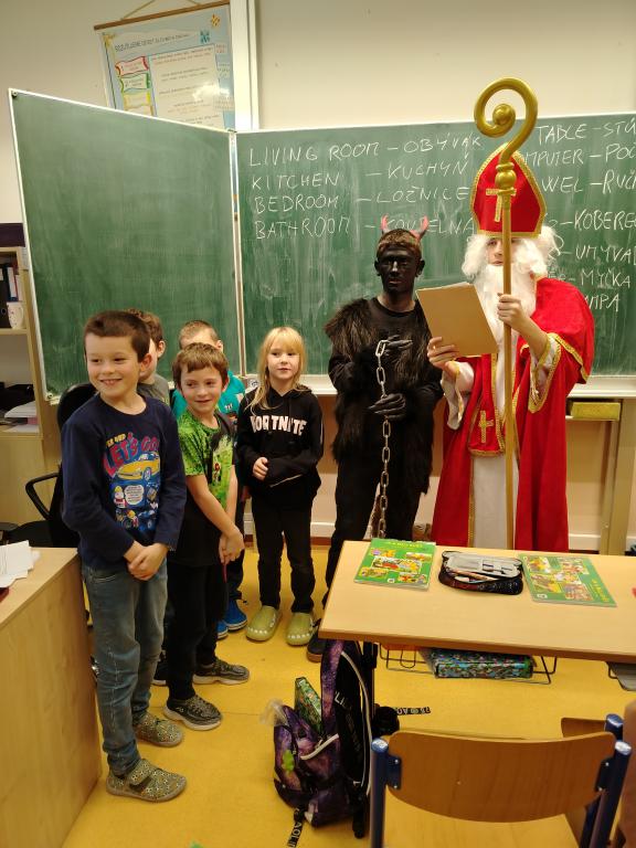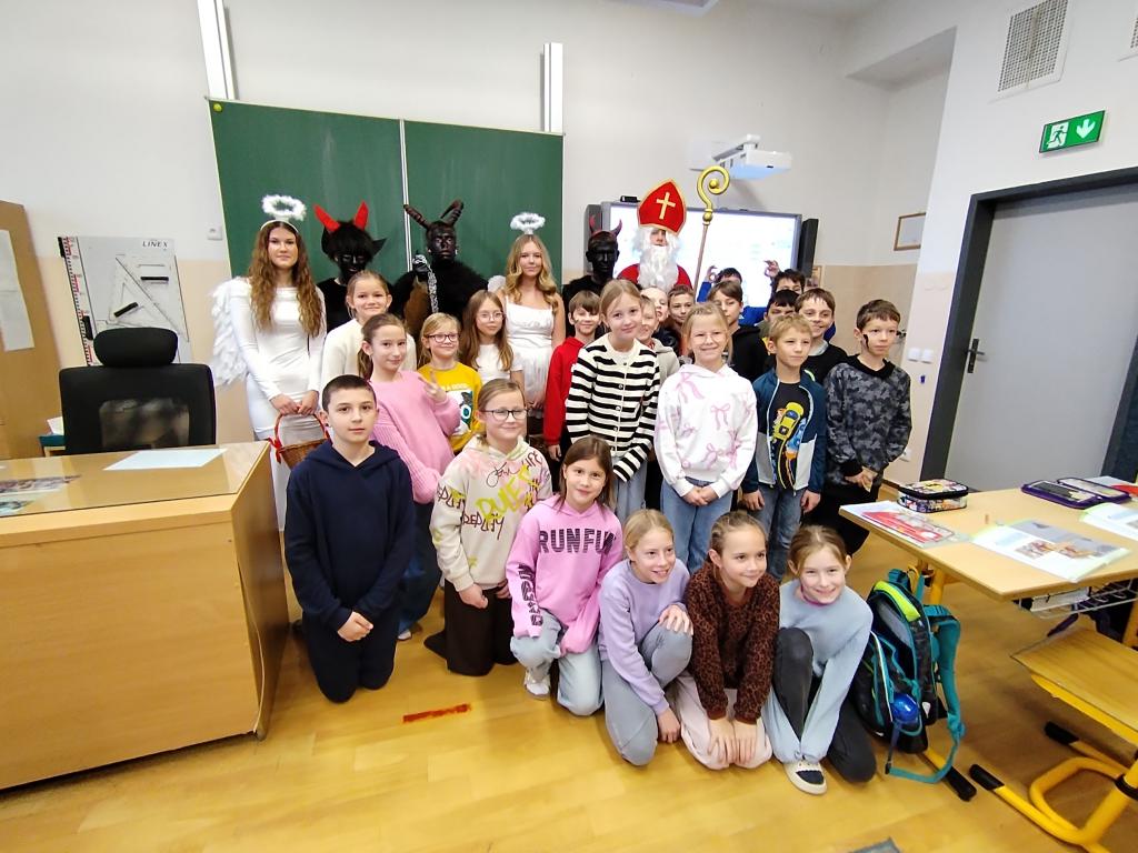 Mikuláš měl předem připravený seznam hodných i zlobivých dětí, na seznamech nechyběly např. ani spící princezny. Několik třídních mělo pro své děti připravenou zprávu přímo z pekla. V některých třídách se to přímo hemžilo čerty i anděly, za které se převlékli sami žáci 1. stupně. Během celého dopoledne nechyběly říkanky, básničky, písničky, několikrát děti zazpívaly i českou hymnu. Všechny děti dostaly od andělů sladkou odměnu.