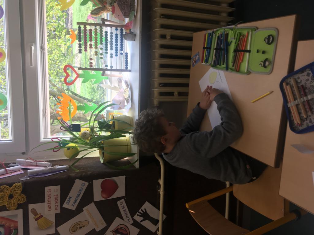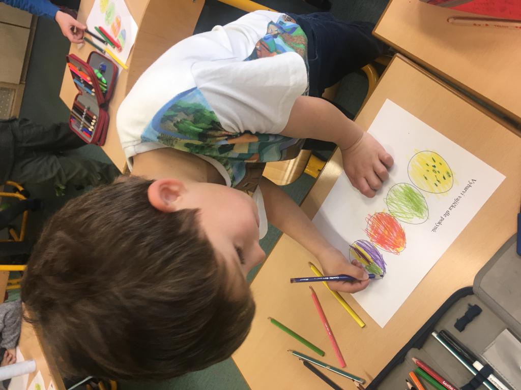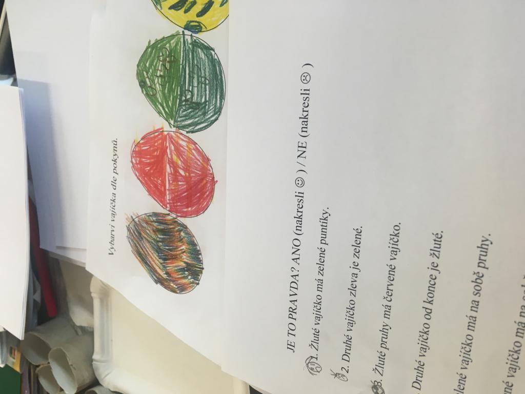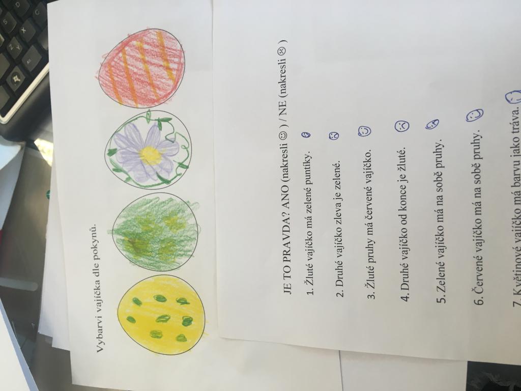 Poslední vyučování před Velikonocema jsme z části věnovali právě této tradici. Krom vyprávění jsme si mohli beztrastně zaběhat po třídě a vybarvovat podle návodu na tabuli vajíčka. A pak odpovídat na otázky ano :) / ne :(. Porozumět přečtenému ještě někomu dalo trochu zabrat, stejně tak i pravá - levá, začátek a konec. :)
