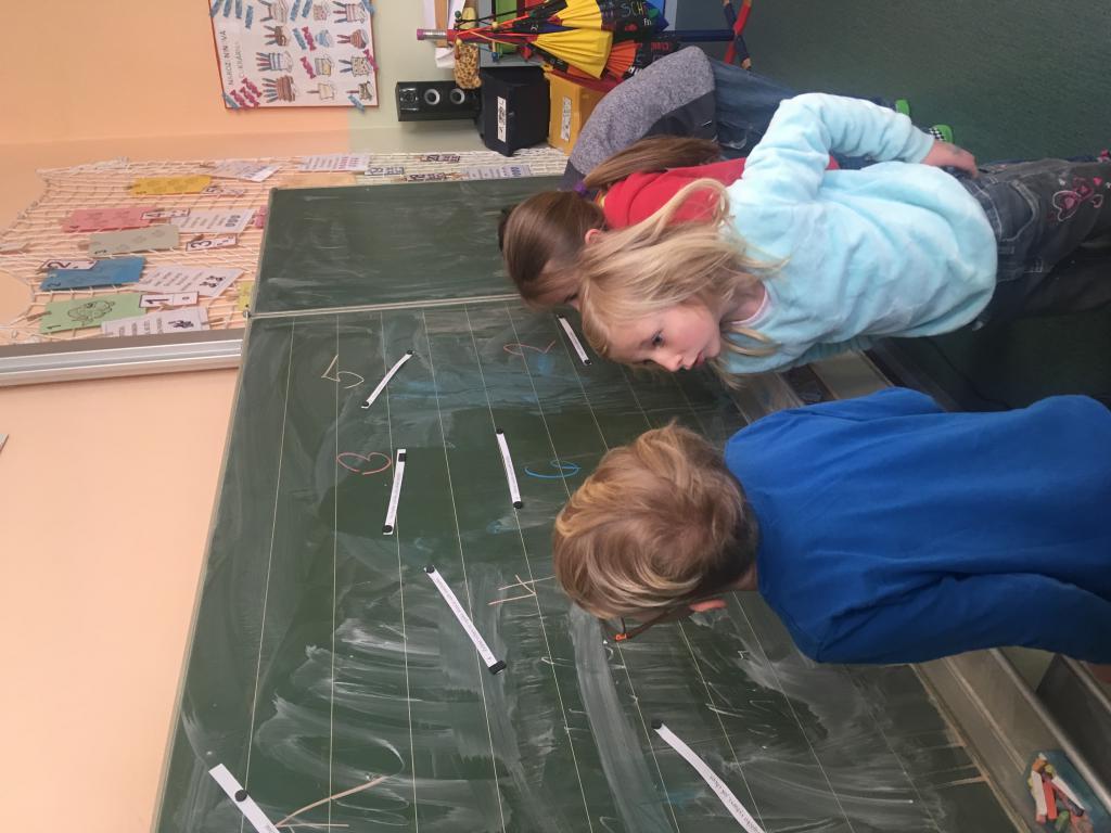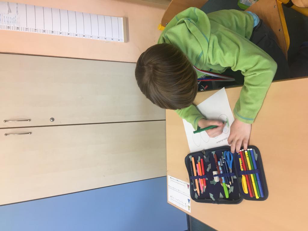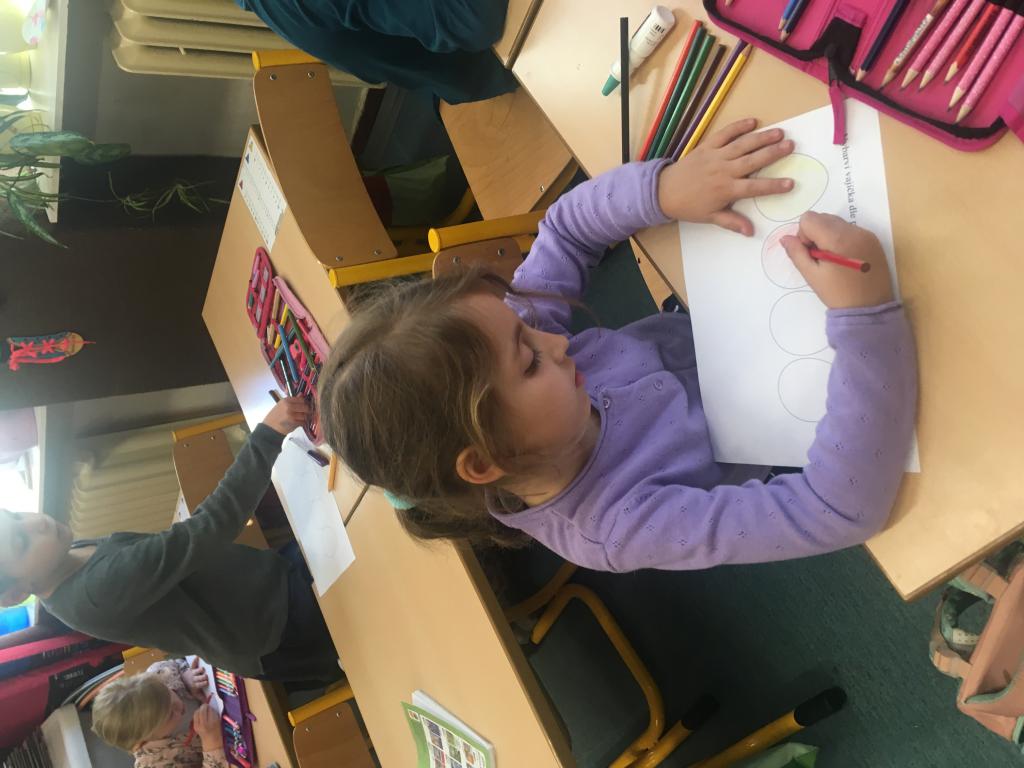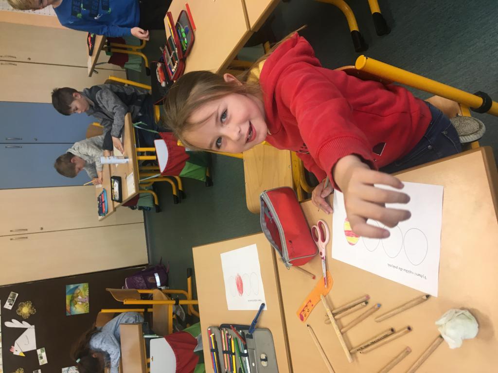 Poslední vyučování před Velikonocema jsme z části věnovali právě této tradici. Krom vyprávění jsme si mohli beztrastně zaběhat po třídě a vybarvovat podle návodu na tabuli vajíčka. A pak odpovídat na otázky ano :) / ne :(. Porozumět přečtenému ještě někomu dalo trochu zabrat, stejně tak i pravá - levá, začátek a konec. :)