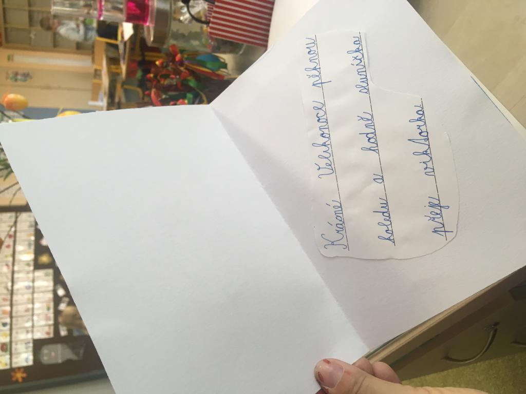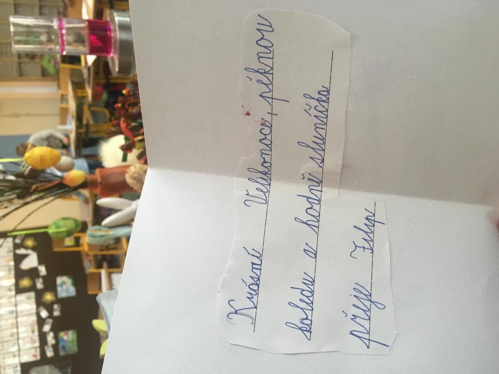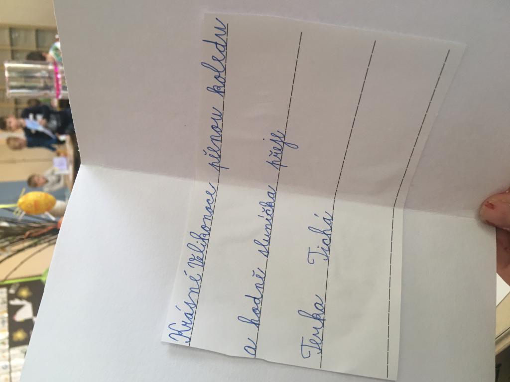 Nakonec jsme si vytvořili a napsali jednoduché velikonoční přáníčko. Popřáli jsme v něm krásné Velikonoce a to vinšujeme i nyní. Užijte si prázdniny a v úterý se zase uvidíme. :)