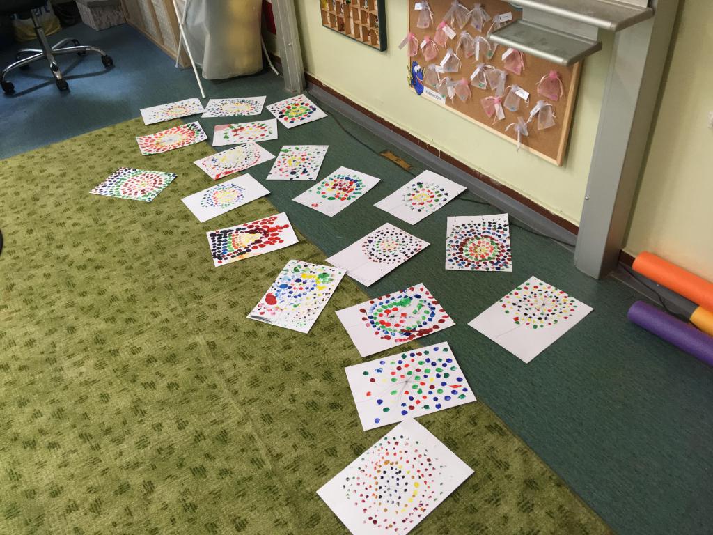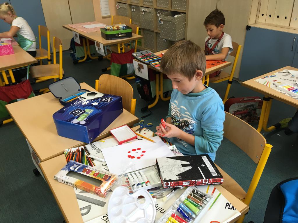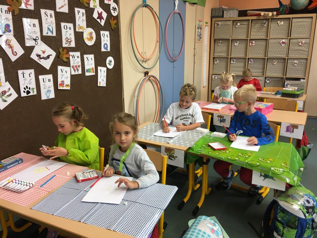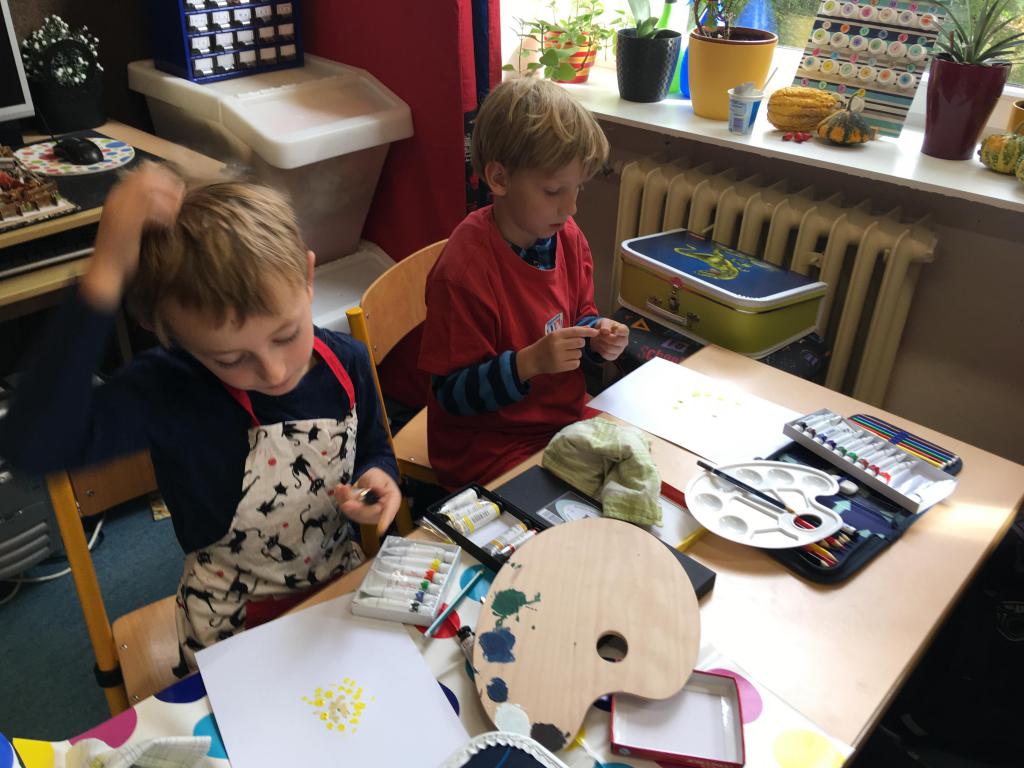 Při výtvarné výchově a pracovních činnostech měly premiéru temperové barvy. Dílo se zdařilo! Můžete se kochat na chodbě školy vedle naší třídy. :)