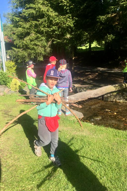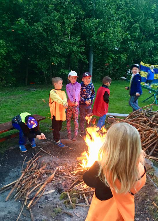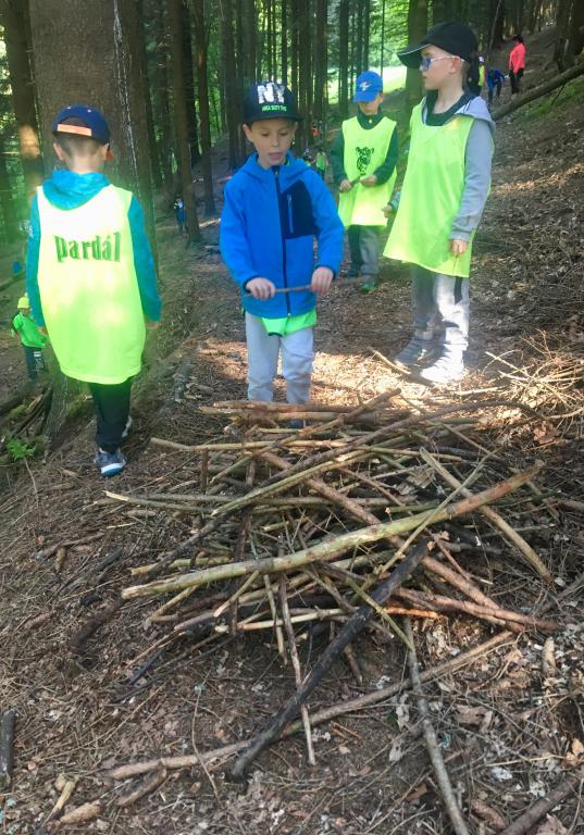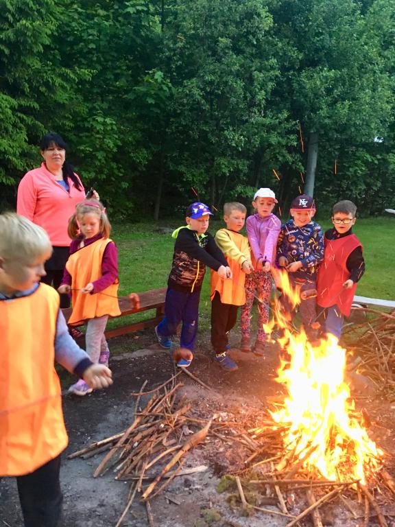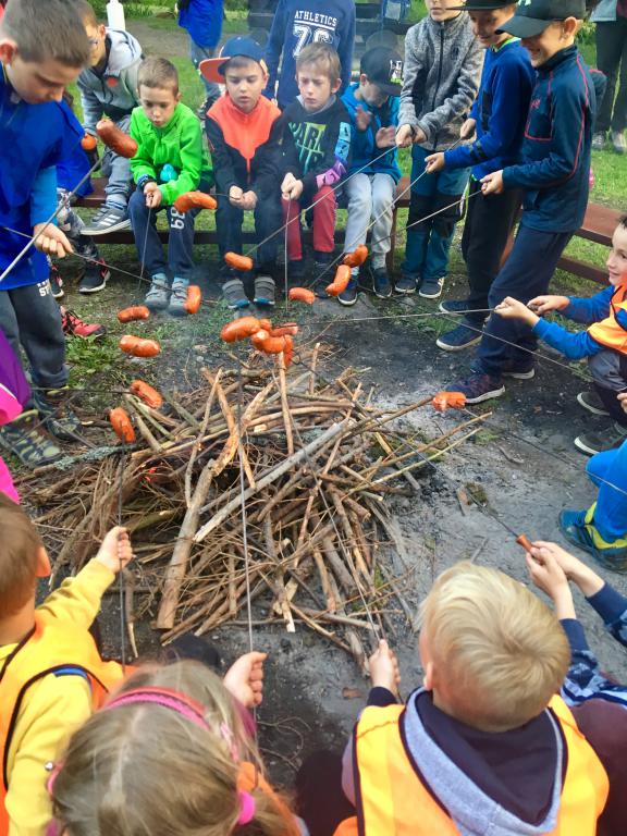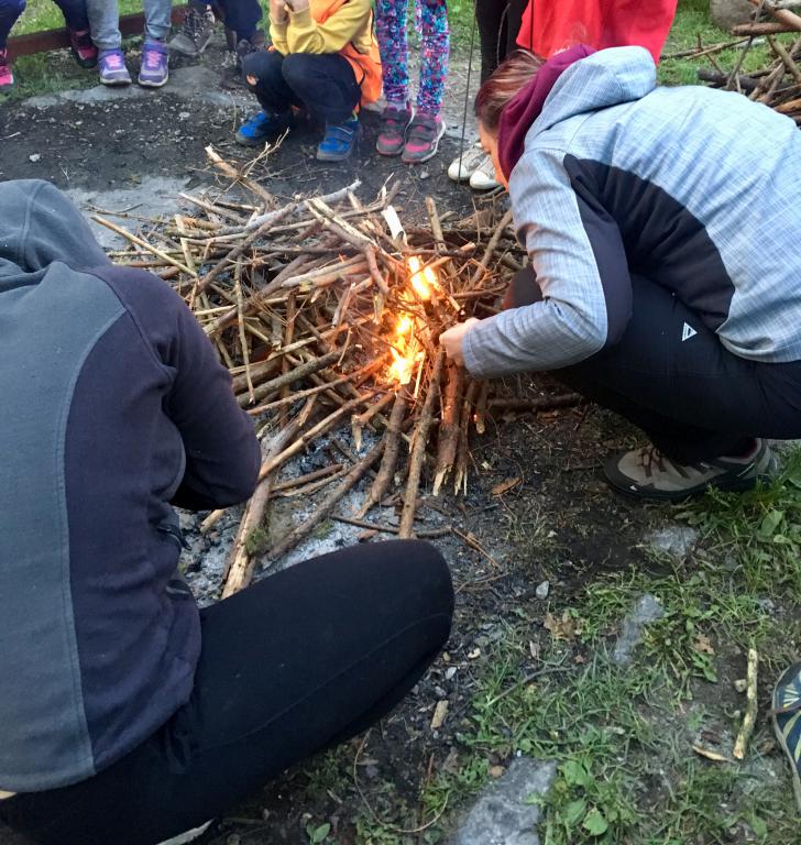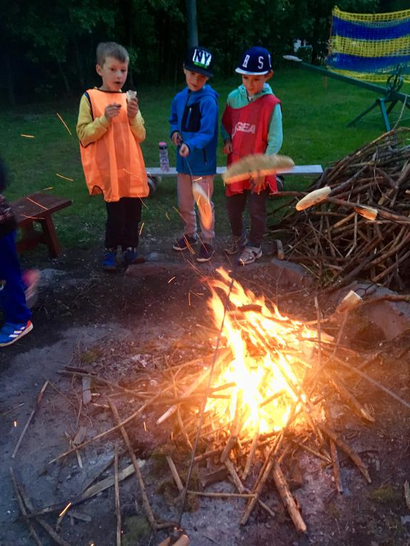 Do lesa jsme šli ještě jednou. Sbírat klacky na večerní táborák a opékání buřtů (druhá - dobrovolná - večeře). Na lávce děti s plnou náručí vypadaly jak mravenečci. :) Rozdělat večer oheň z navlhlého dřeva byl docela oříšek, ale paní asistentka Kája si s tím nakonec poradila. Po tomto zážitku jsme si před spaním ještě trochu zabalili věci a zavrtali se do postýlek.
