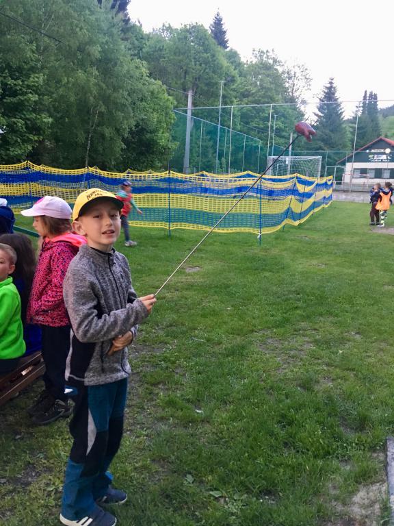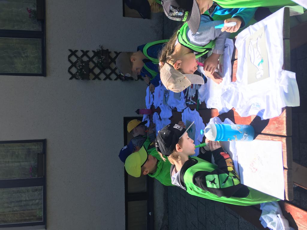 Pokračoval turnaj týmů v kopané a vybíjené a zapojili jsme i estetično a naše výtvarné dovednosti. Na bílá trička jsme si mohli přes šablonu "nafoukat" obrázek. Bavilo nás to a dařilo se nám. :)