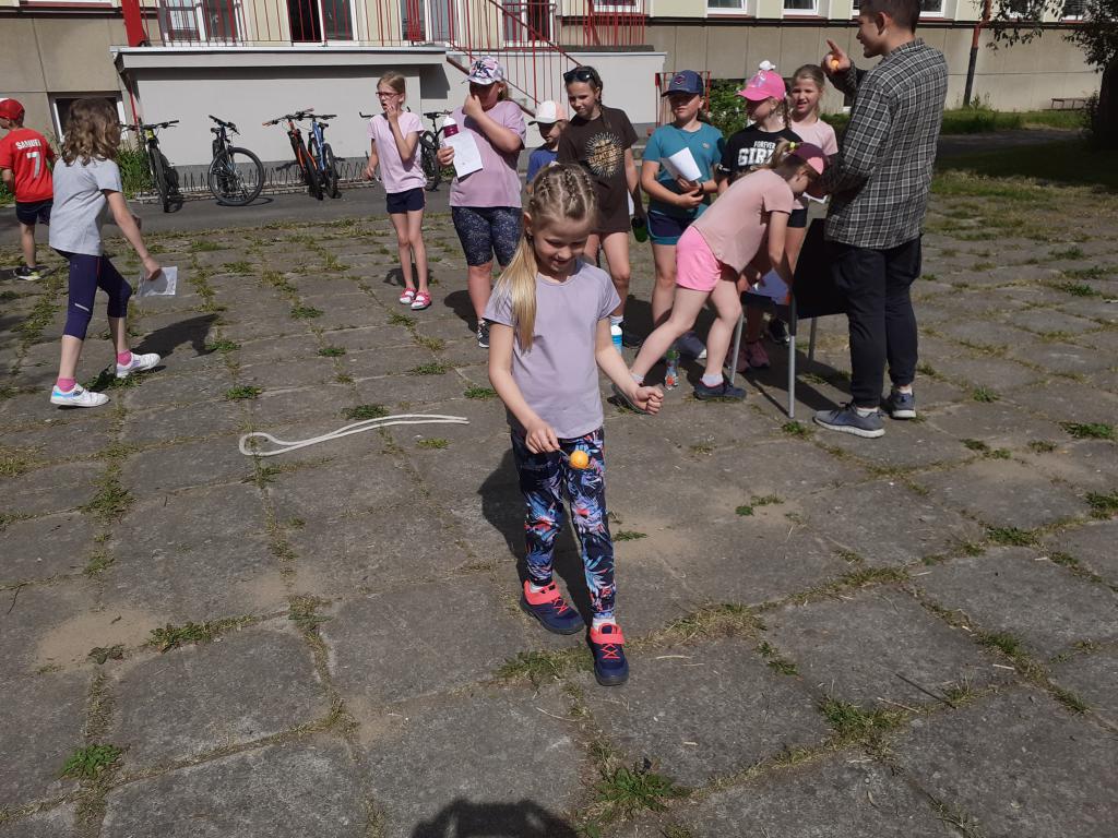 Děti si vyzkoušely chůzi na špalcích, střelbu na koš, skákání v pytli, opičí dráhu, hod na cíl, poznávání plodin, Kimovu hru,....