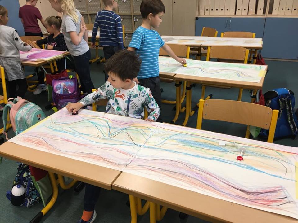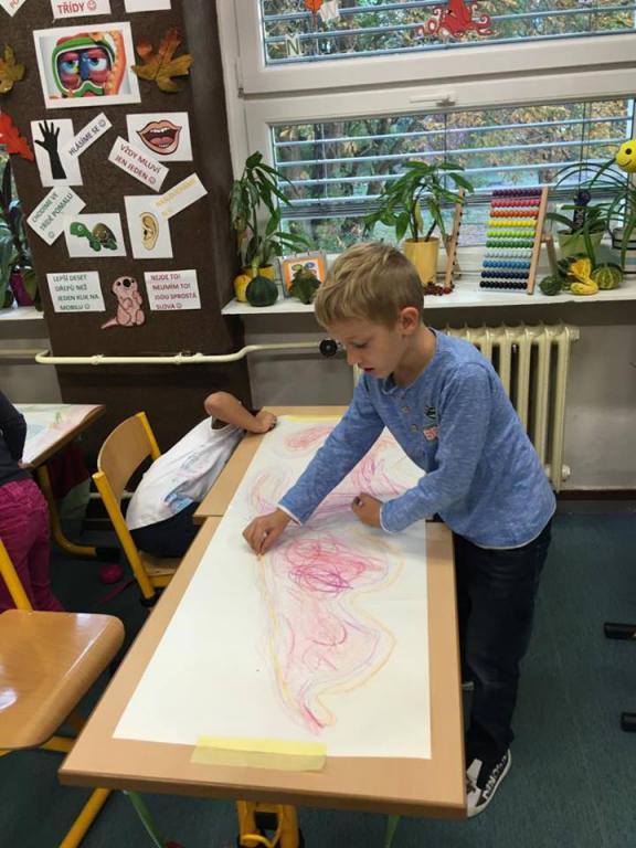 Dnes jsme ozkoušeli namalované silnice a projeli se i v sousedních oblastech. Rovinky i zákruty jsme zvládli jak s autíčkem nebo plyšákem, tak pastelkou a nakonec tužkou v naší první písance na první stránce. Byla to velká událost! :) Všichni jsme dostali jedničku i razítko. Také jsme si zkusili, jaké to je být paní učitelka a kontrolovat správné výsledky :) A trochu se škodolibostí jsme se naučili psát šestku. :)
