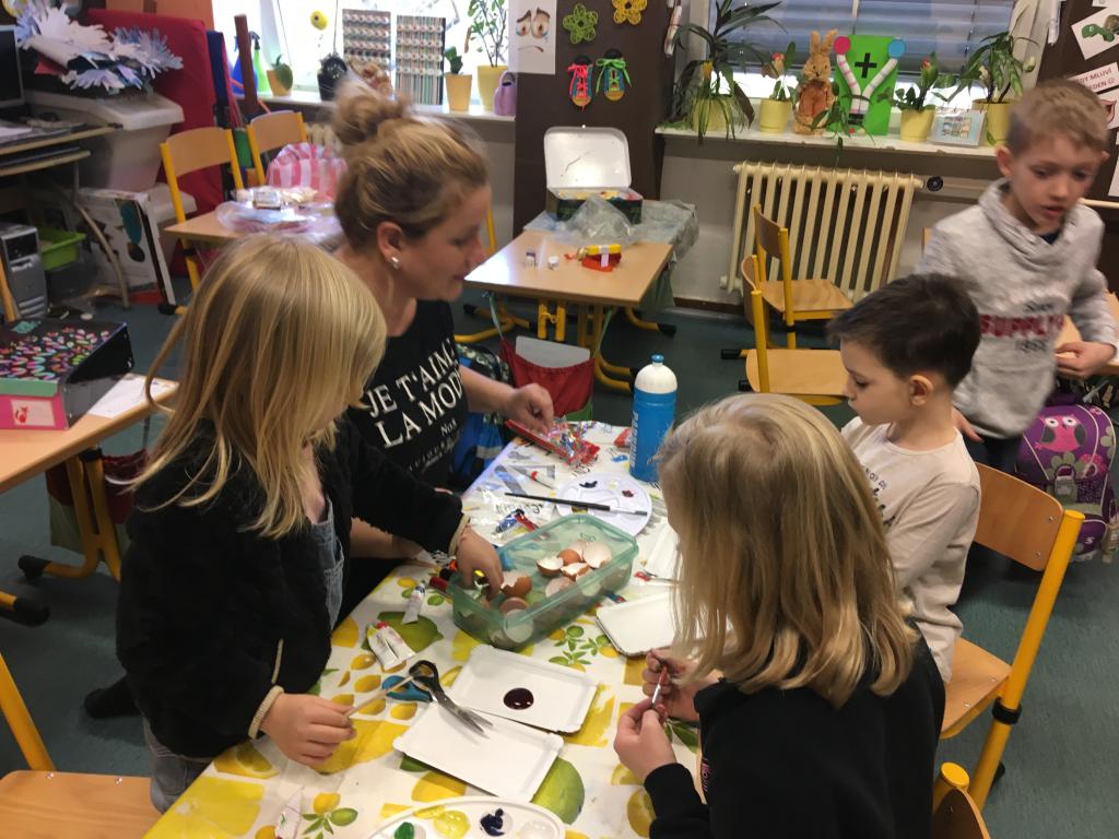 Středeční program touto událostí ještě zdaleka nekončil. Po prvouce, kdy jsme si opakovali určování času na "ručičkových hodinách" a po obědě, si pro nás připravila Vojtova maminka spolu se slečnou vychovatelkou Lenkou pracovní dílničky. Vyráběly s dětmi beránky, vajíčkové zápichy a věnce na velikonoční jarmark, který bude příští týden u nás ve škole. Nadšení dětí bylo velkou odměnou pro všechny dospěláky a na krásných výrobcích je to vidět. :)