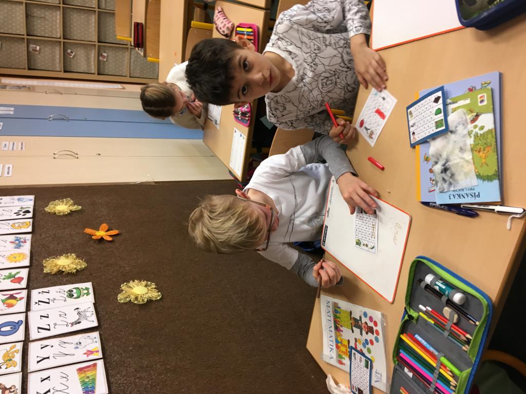 V úterý se na nás přišla na hodinu českého jazyka podívat budoucí paní učitelka Štěpánka, která dětem dala přiléhavou přezdívku "turbo myši"... Zkrátka ani chvilku nejsme v klidu, chceme všichni odpovědět nejlépe ihned a najednou. Ozkoušené aktivity zvládáme "levou zadní" a do nových se "vrháme" s nadšením. Třeba jako na běhací diktát, při kterém jsme nalezená písmenka zapisovali na "xylofon". Co nám vyšlo? Že je jaro tady! První jarní den jsme si tedy připomněli barevně. Kéž by nám to nadšení vydrželo co nejdéle!:)