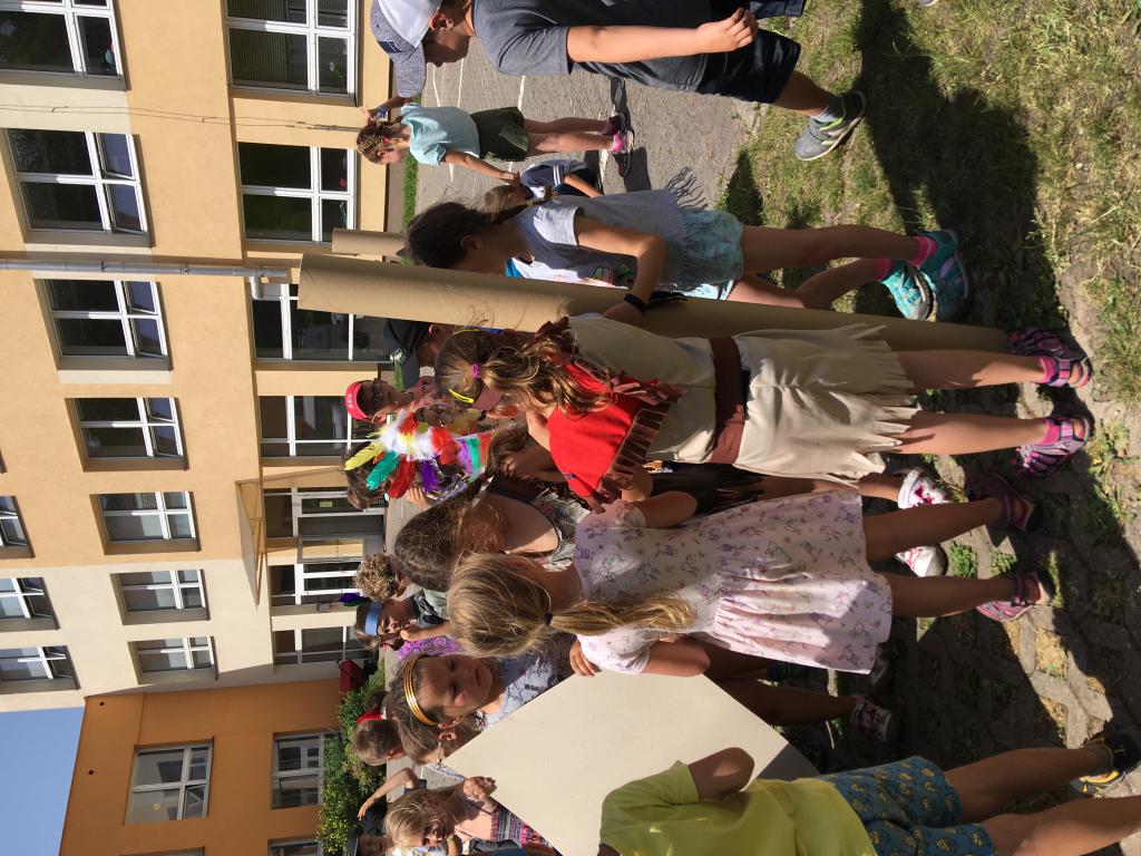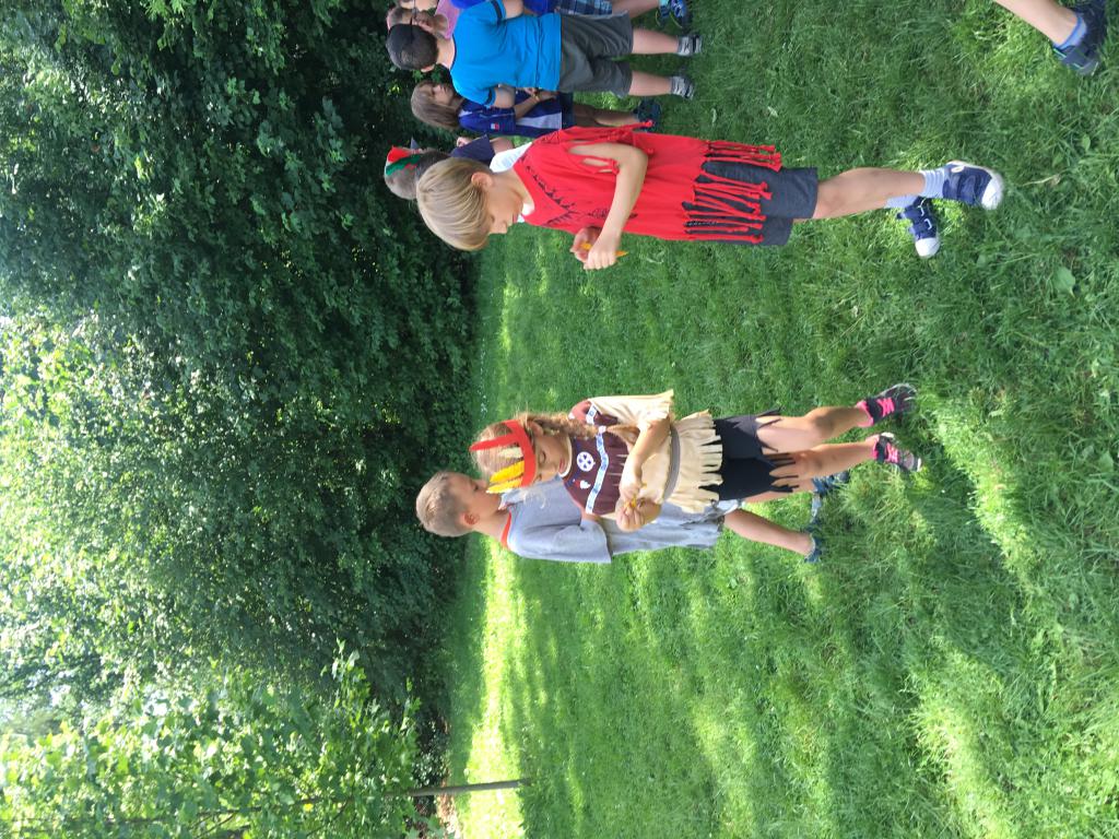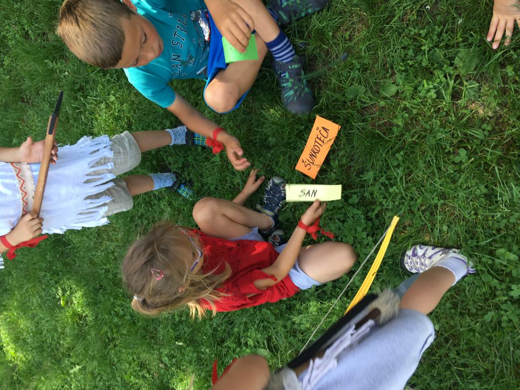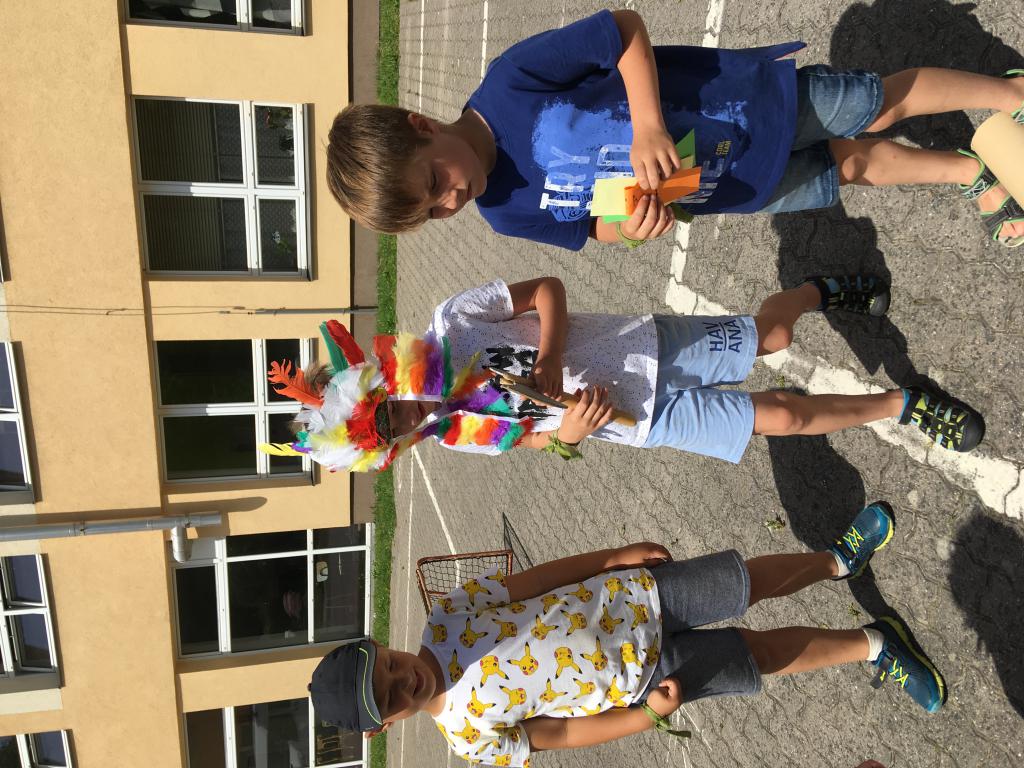 "Po o" začal indiánský program. Spolu s choltickými prvňáčky jsme byli rozděleni do družstev a pomocí úkolů jsme získávali kartičky a z nich pak poskládali jméno své skupiny. Místní "školní indiánská náčelnice" nám přečetla legendu a po ní následoval kvíz pozornosti. Za správné odpovědi jsme získávali body pro svůj tým. Jako správný indiánský kmen jsme pomáhali vyrábět totem. Ještě jsme si stihli prohlédnout indiánské teepee, ve kterých choltické děti budou nocovat, poděkovali slečně učitelce Daniele Čepčářové za pozvání a pohostinnost a vyrazili plní dojmů a trošku i unavení na cestu zpět. Těšíme se na další shledání. :)