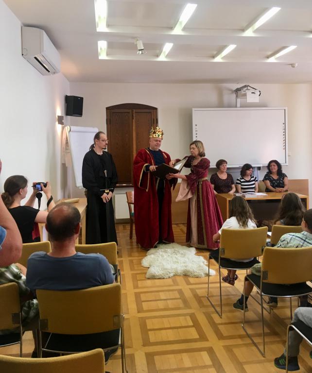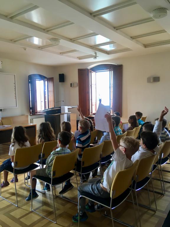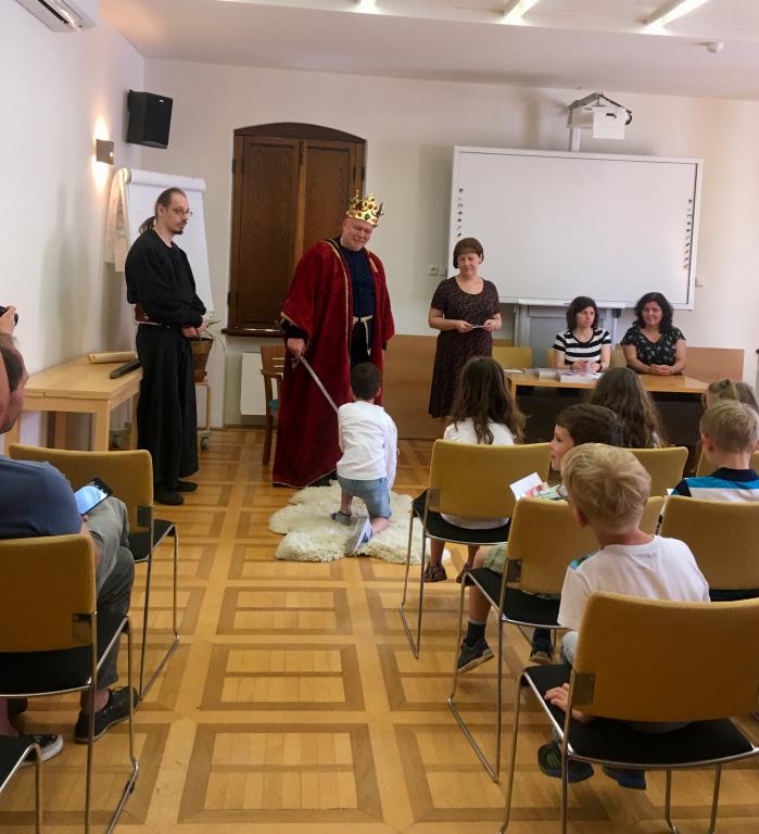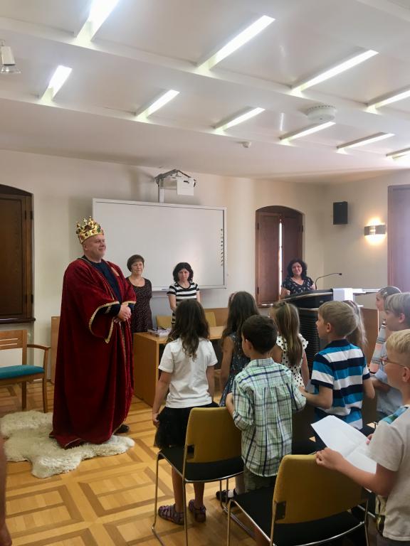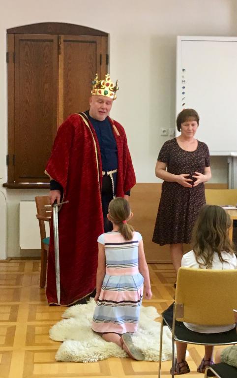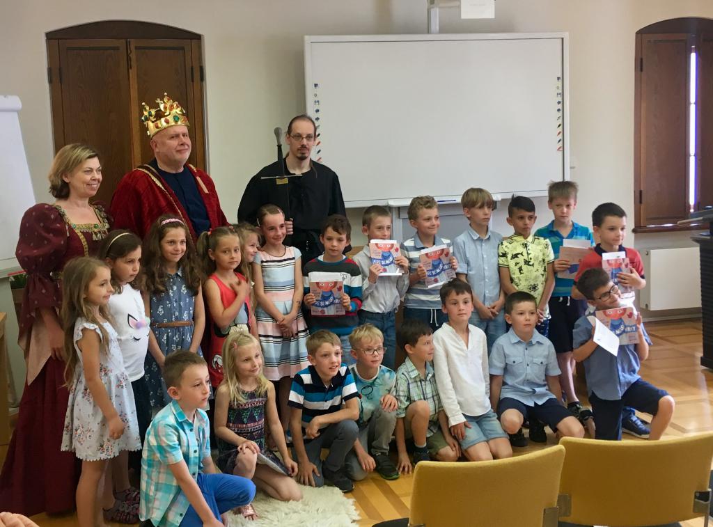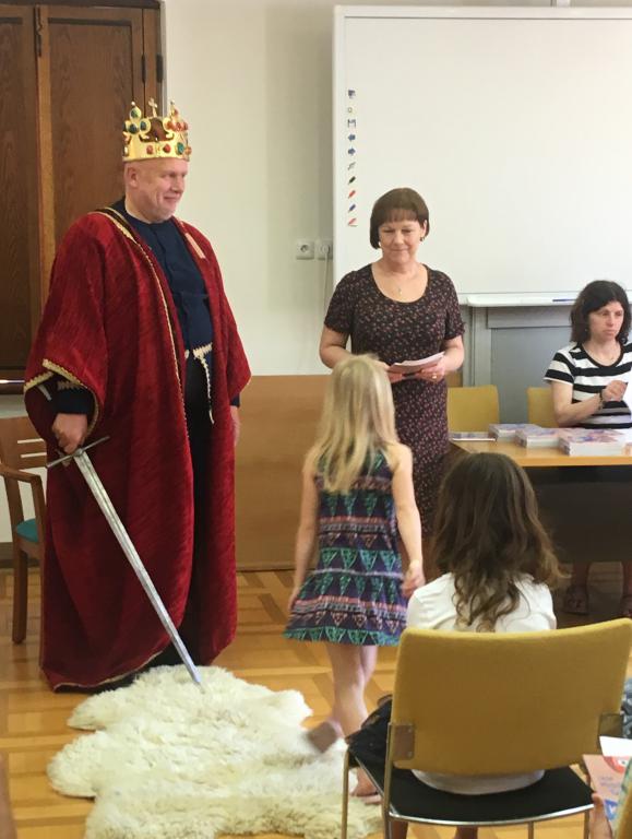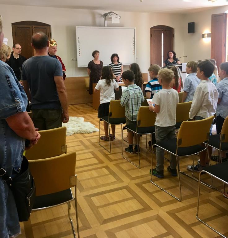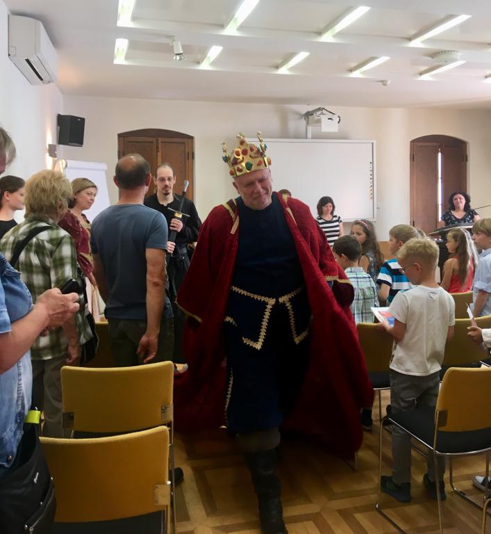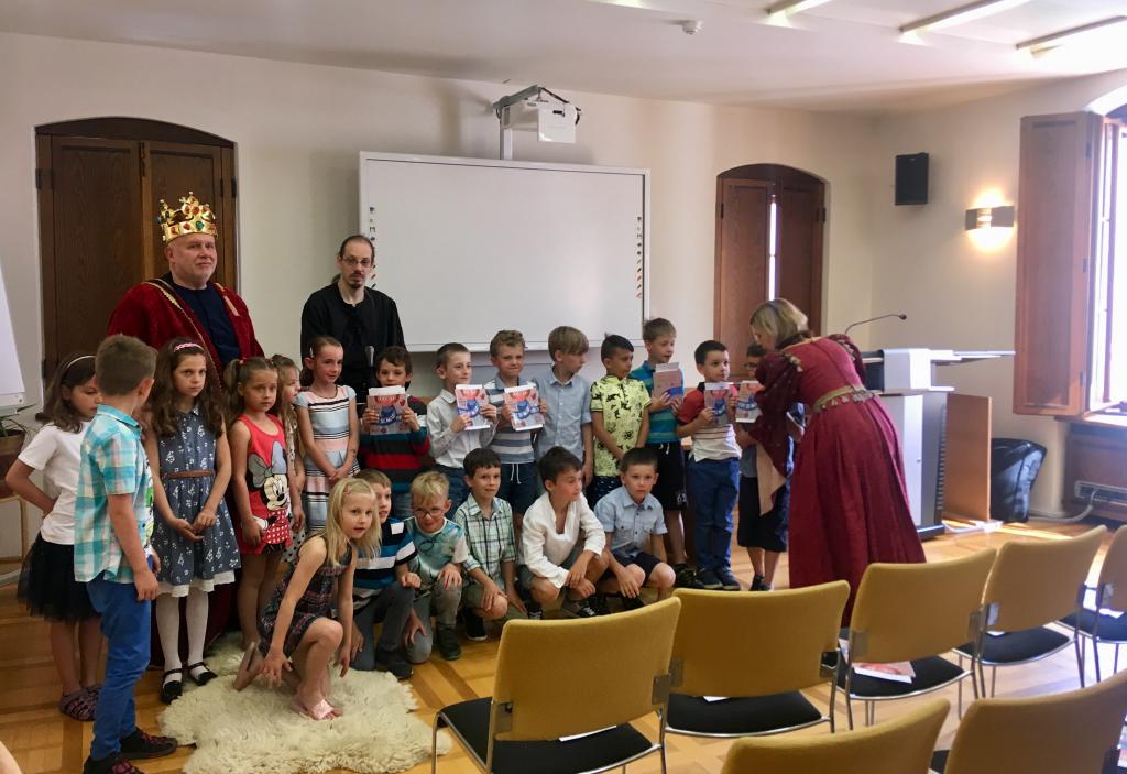 Ve čtvrtek 6. 6. 2019 byla naše třída v Krajské knihovně v Pardubicích oficiálně prohlášena za děti, které umí číst. Pasování na čtenáře proběhlo za přítomnosti některých rodičů a prarodičů. Ikdyž jsme měli na přípravu našeho vystoupení opravdu málo času, zvádli jsme ho s pěkným nasazením. Král Vendelín pak všechny děti pasoval na rytíře. Každý si také odnesl knížku Miroslava Tvrze "Kde se nosí krky". Je plná pěkných čtivých básniček. Jednu z nich jsme si pak přečetli ve škole. Jmenovala se Klokanice a byla veselá.