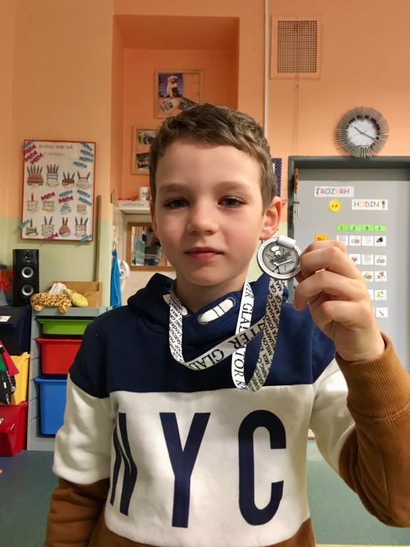 Další šikovná sportovkyně, která nám přinesla ukázat medaili, je Sárinka. Ta se dokonce zúčastnila 52. ročníku Jizerské 50 - dětského mini závodu. V nás všech vzbudila velký obdiv, protože závodila na běžkách. Také gratulujeme!