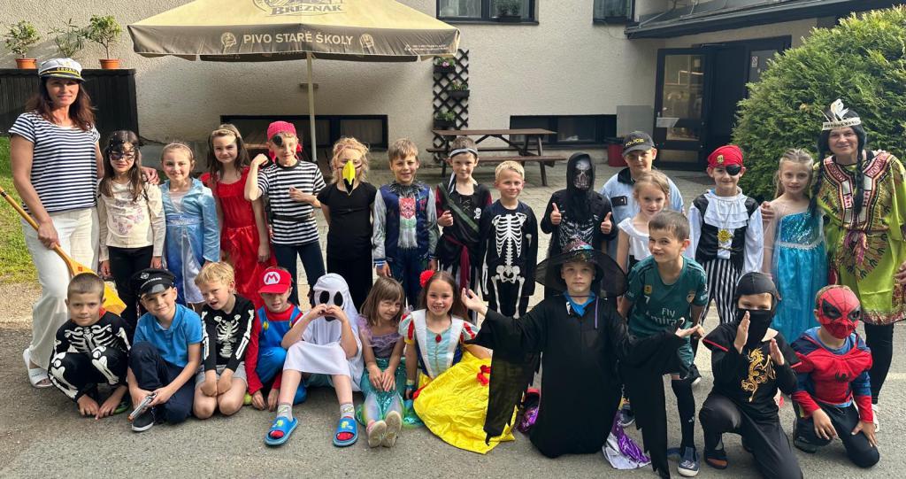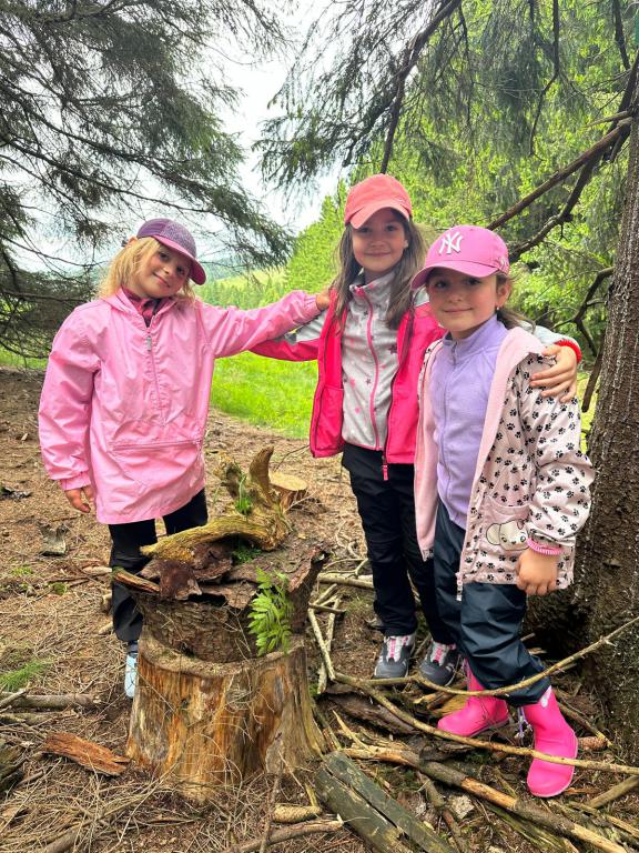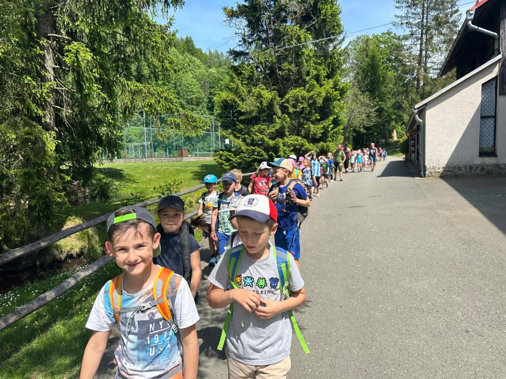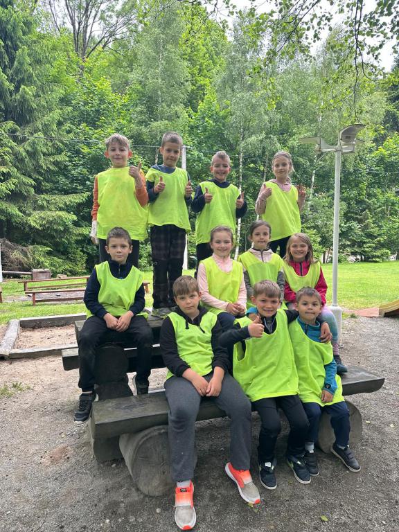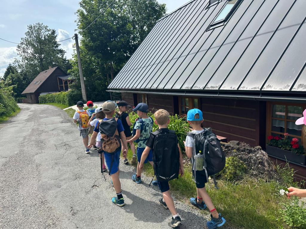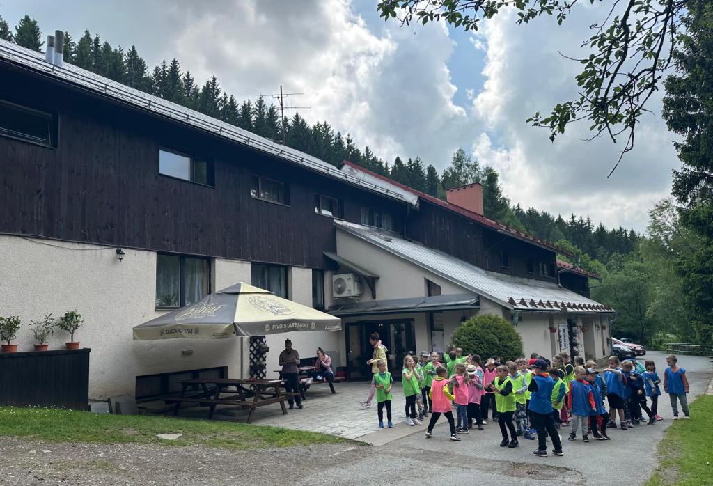 U chaty je krásné sportovní a dětské hřiště s pískovištěm, houpačkami a neodolatelným potůčkem, které plavčíkům a jejich kamarádům z 1.B nabízelo mnoho možností k hrání a fotbalu.