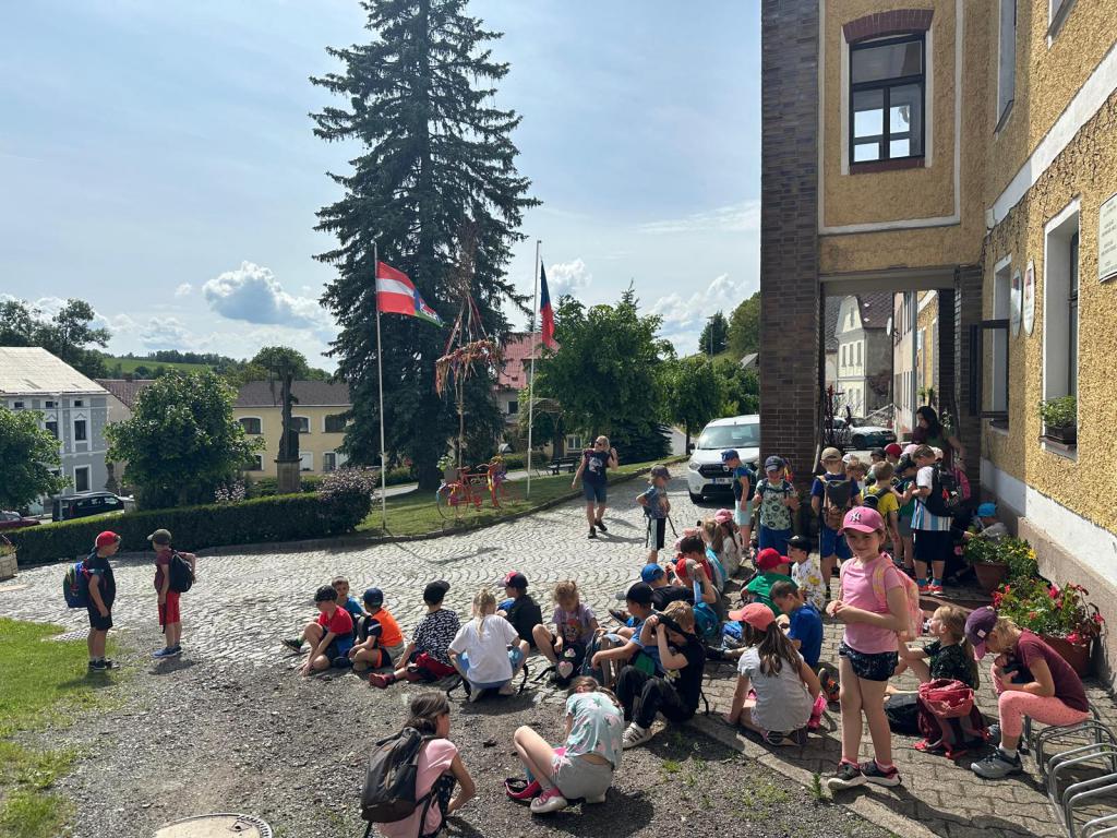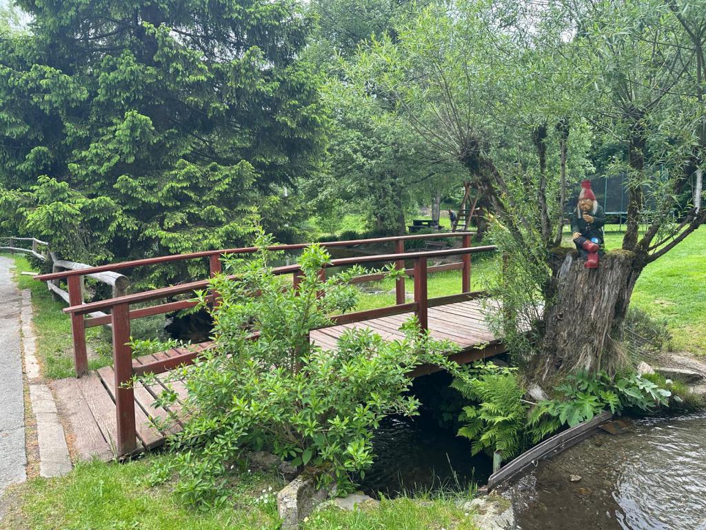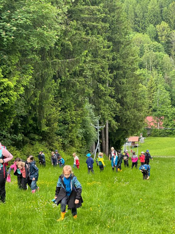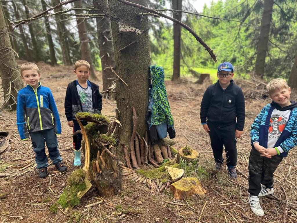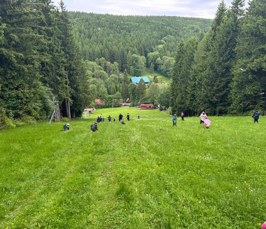 U chaty je krásné sportovní a dětské hřiště s pískovištěm, houpačkami a neodolatelným potůčkem, které plavčíkům a jejich kamarádům z 1.B nabízelo mnoho možností k hrání a fotbalu.