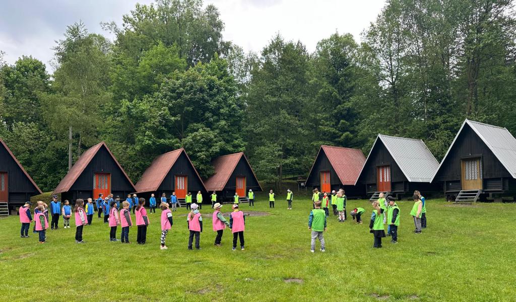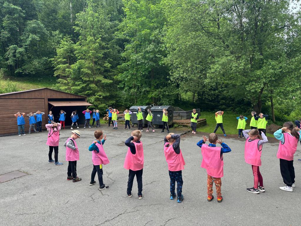 Každodenní rozcvičkou jsme nastartovali další dopoledních disciplíny, které děti plnily ve svých barevných družstvech – trojskok, běh do kopce, překážková dráha, ….