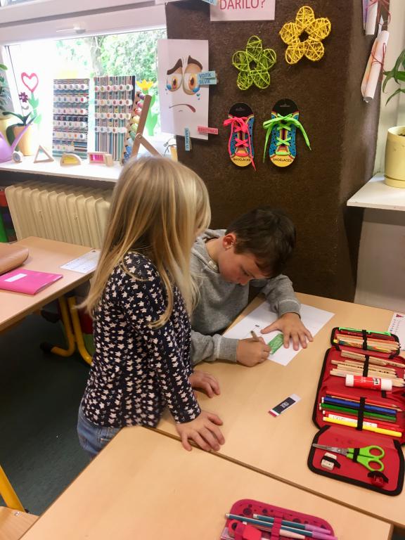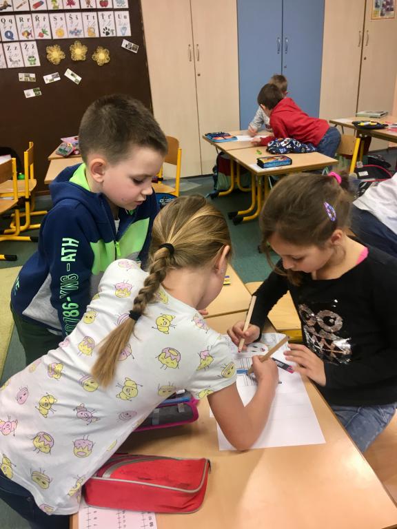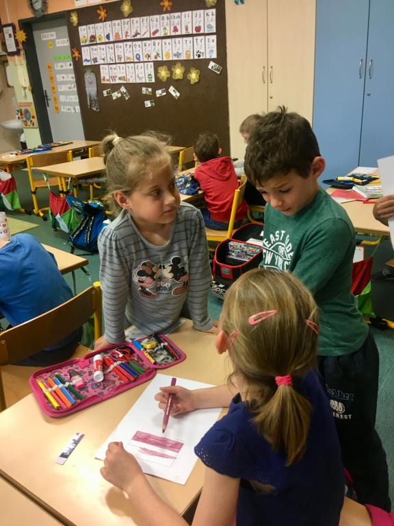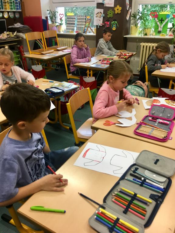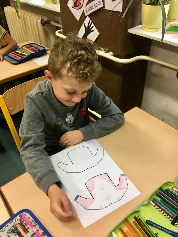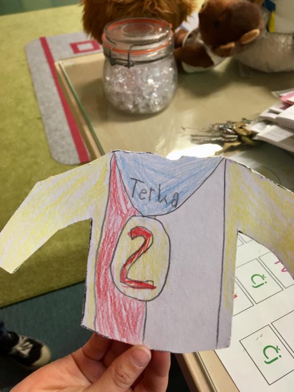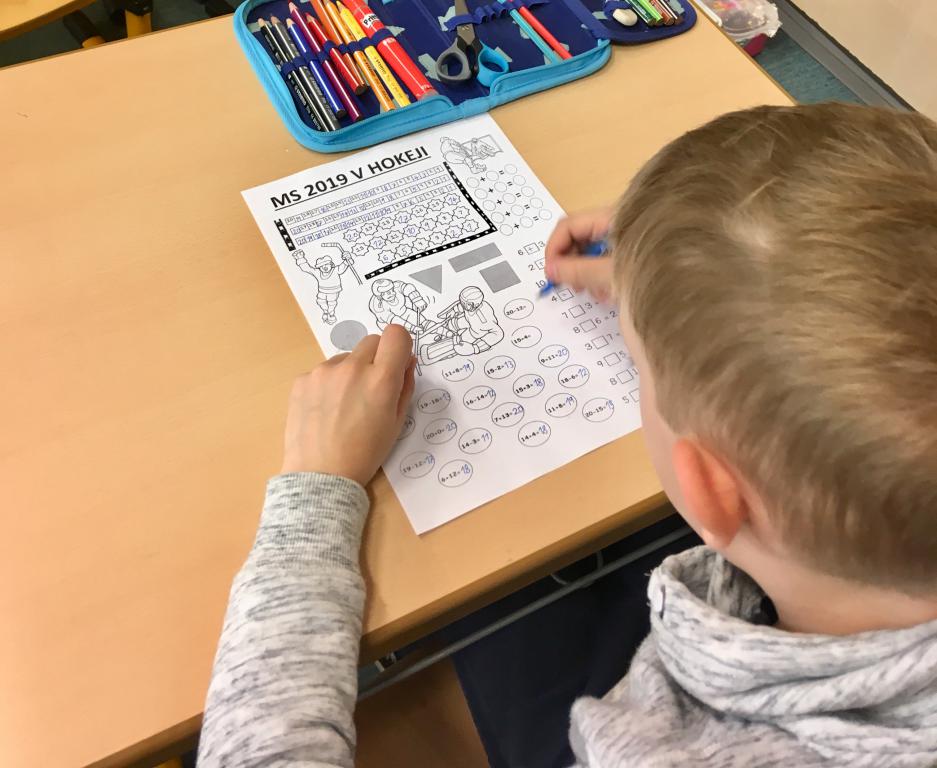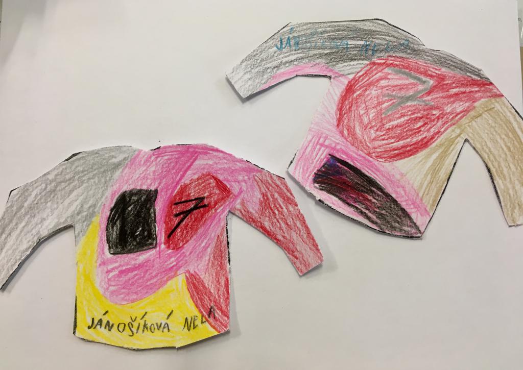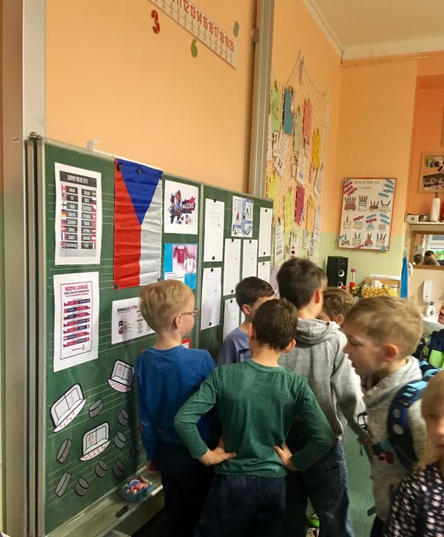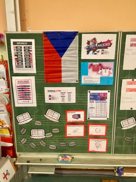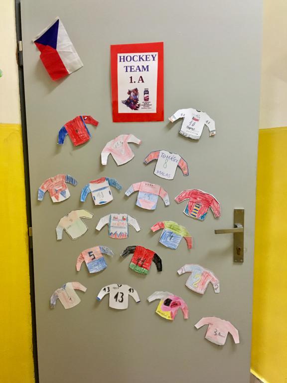 A v pátek se z nás stali fanoušci hokeje. Na tabuli se objevili informace o mistrovství světa, které probíhá na Slovensku v Bratislavě a v Košicích. I my jsme si vylosovali čísla dresu, mohli jsme si ho navrhnout a vytvořit. Proběhla nominace do jednotlivých družtev a tím začala naše třídní soutěž s hokejovou tematikou. I ona půjde od základní části až po finále. Nechybí ani trestná lavice! :) Držte palce nejen našemu hokejovému týmu, ale i nám z áčka. :)