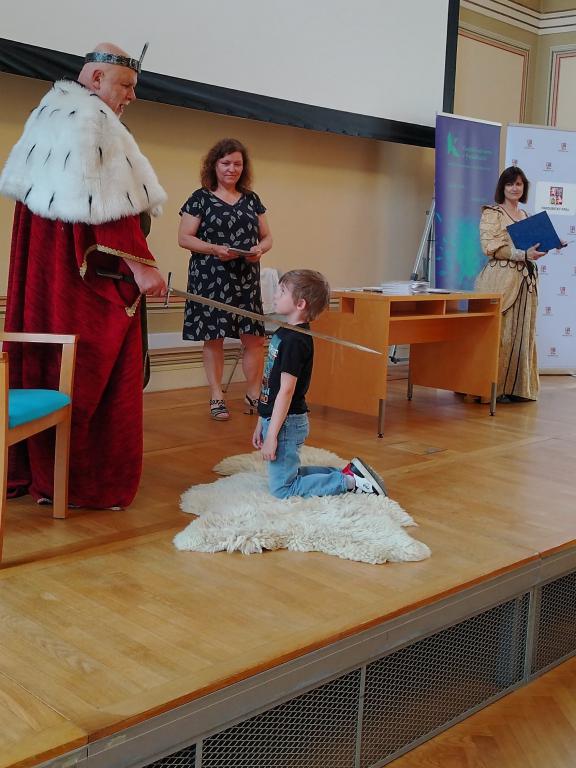 V úterý 3. června jsme se všichni vydali pěšky na radnici na slavnostní pasování prvňáčků na čtenáře. Usadili jsme se ve Společenském sále a nedočkavě jsme čekali na příchod krále Vendelína.
