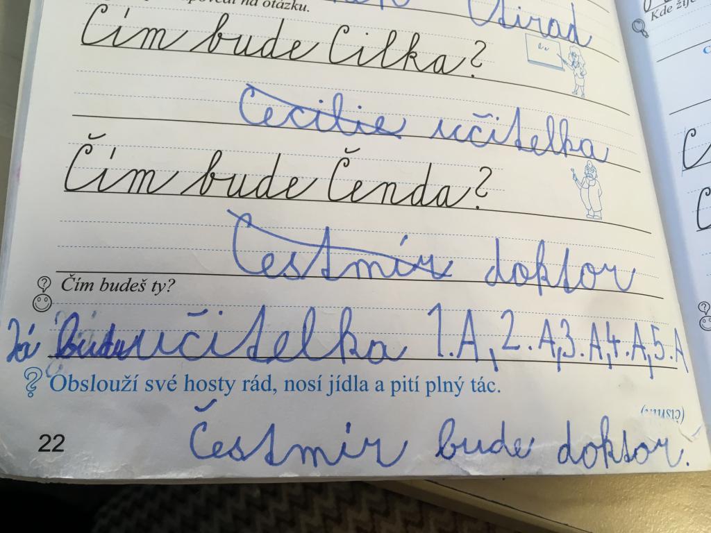 Počítáme do 100 a rýsujeme o 106 a také píšeme. Tentokrát jsme dostali úkol napsat, čím budeme. V našem áčku máme pět budoucích učitelek, jednu kadeřnici a jednu kadeřňyci, foDbalistu, basketbalistu i ragbistu... a jednoho řeďytele banky! :) Všem dětem moc držím pěsti, aby se jim jejich přání splnila. :)