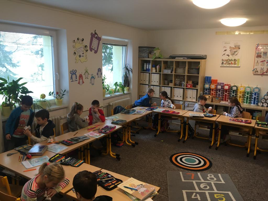 Pohádky se nám objevovaly i v písance, kde procvičujeme opis a přepis a luštíme zamotaná slova. Pohádkové znalosti jsme si ještě procvičily při AZ kvízu. Konečně jsme tak využili pyramidu, která nám už nějakou dobu krášlila učebnu. Stále nezbýval čas... Vyhráli oranžoví, kterým se jako prvním podařilo propojit všechny tři strany. Hra posloužila jako motivace pro výtvarku, kde si každý nakreslil svou oblíbenou pohádkovou bytost.