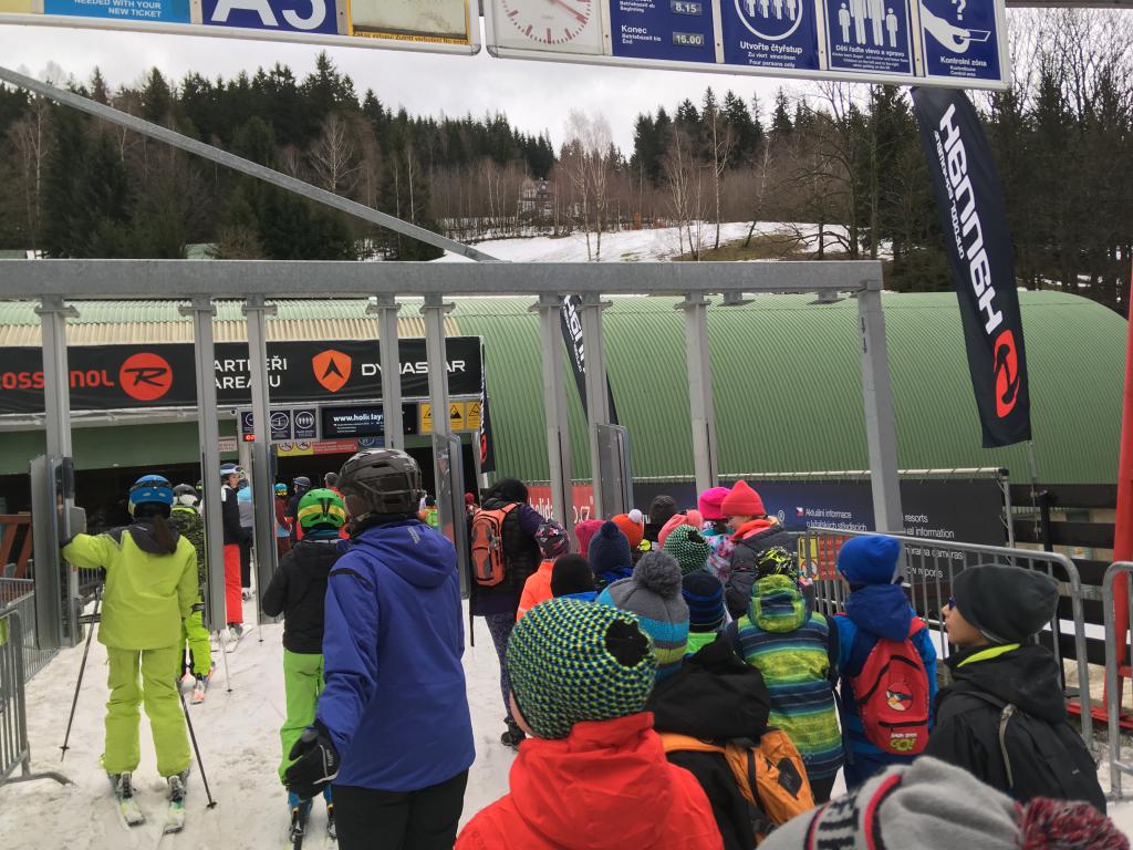 Došli jsme pod "naši" sjezdovku na Hvězdu a čekali a čekali... Skibusem jsme pak dojeli do Rokytnice pod lanovku skiareálu Horní Domky. K sedačkové lanovce na Lysou horu jsme ještě chvíli pochodovali a pak přišlo to vzrůšo. Dělili jsme se do trojic s dospěláky a čekali na sedačku. Někteří jeli takto prvně. :)