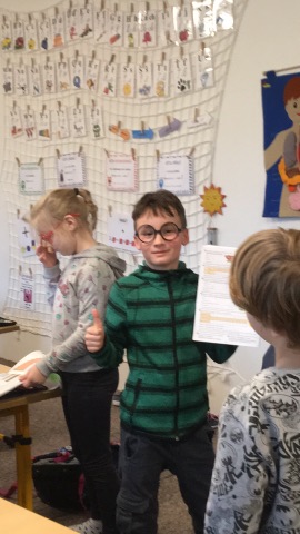 Čtvrtek byl den D z mnoha důvodů. V plánu byl projekt "Finanční gramotnost", zhodnocení a zamyšlení nad uplynulým pololetím, předávání výpisu vysvědčení a ještě loučení se Sárinkou, která přechází na školu v místě svého bydliště. Ta převzala ráno vítací funkci paní učitelky u vstupu do učebny a mohla si vybrat vip osazenstvo svého stolu. :)