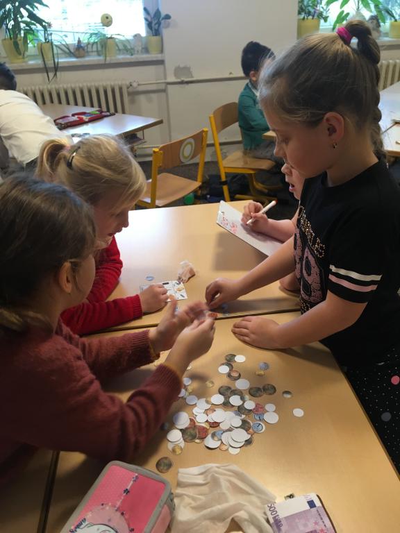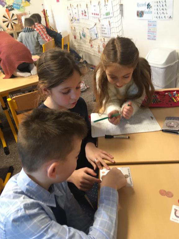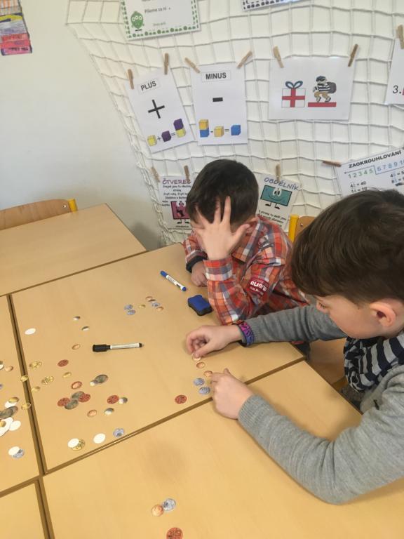 Finanční záležitosti zatím patří spíš do kompetence našich rodičů, nicméně mnohé už známe nebo objevujeme i my. Vyprávěli jsme si o tom, co všechno musí dospěláci uhradit, co je nutné a co nikoli, jak je to s tím "mobilem, který je za korunu", co jsou daně... Už víme, že k tomu aby nás nikdo nenapálil, potřebujeme nejen dobře počítat, ale také výborně a pozorně číst a proč. Spočítali jsme, kolik bychom dostali pěněz, kdybychom měli po jednom kusu všech mincí i bankovek. Správný výsledek je 8 888 Kč. :) Procvičili jsme logické myšlení a hledali jsme různé možnosti, jak uhradit deset nebo 50 Kč. Dělali jsme nákupy a počítali, kolik za ovoce a zeleninu utratíme a kolik nám paní prodavačka vrátí, když zaplatíme stokorunou.Nakonec jsme si zahráli hru "Větší bere". Byly to boje nelítostné. :)