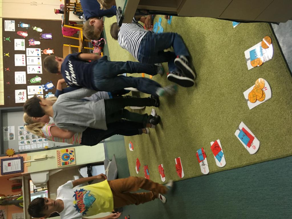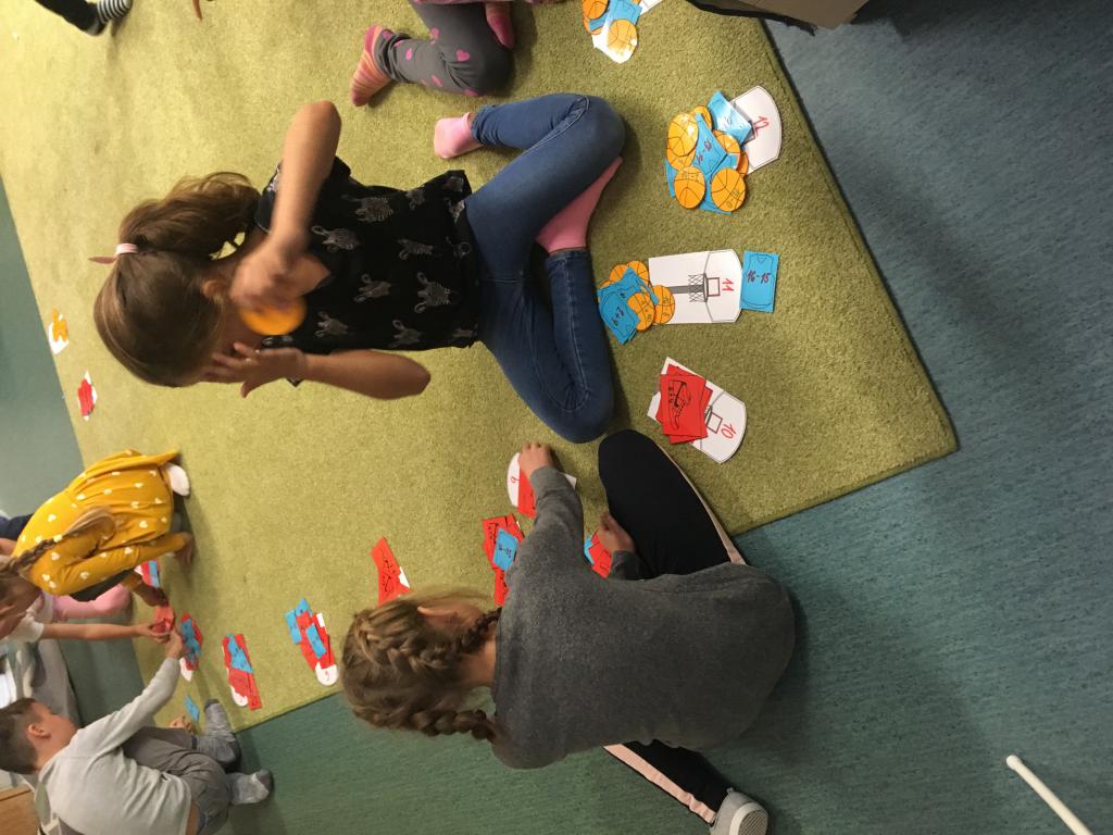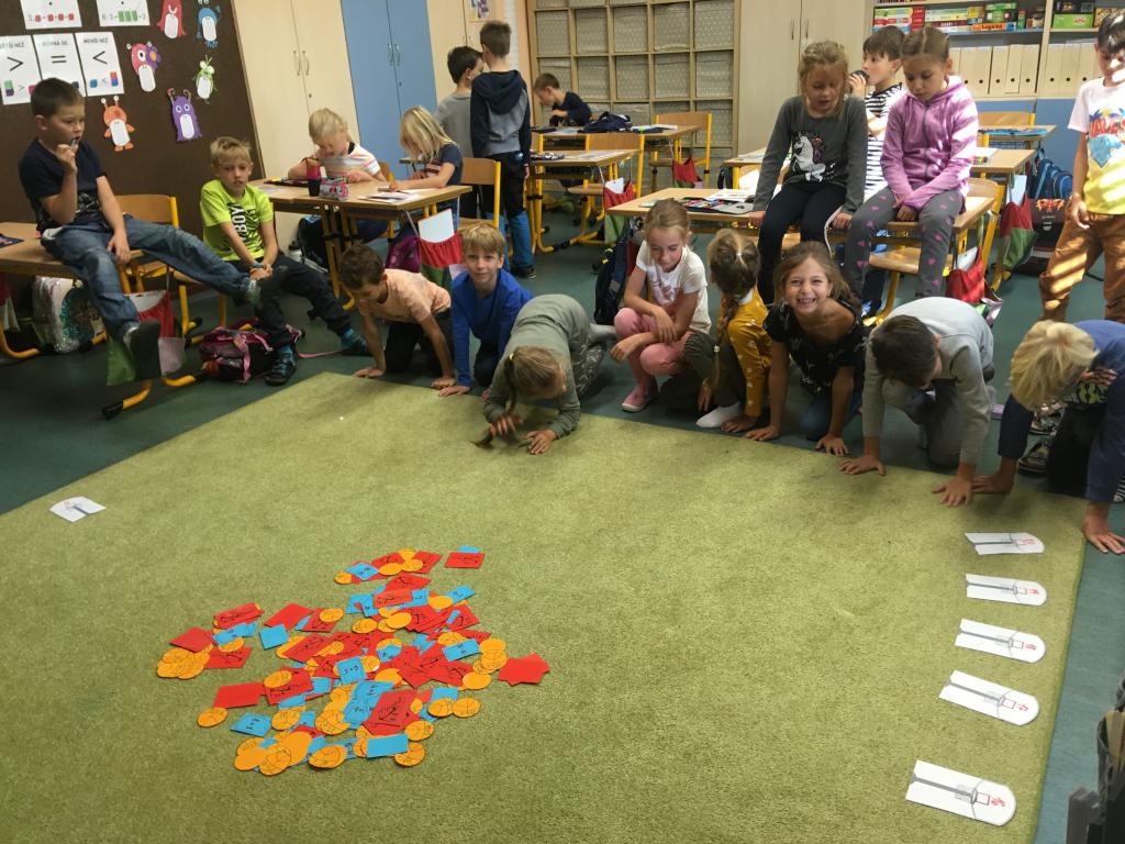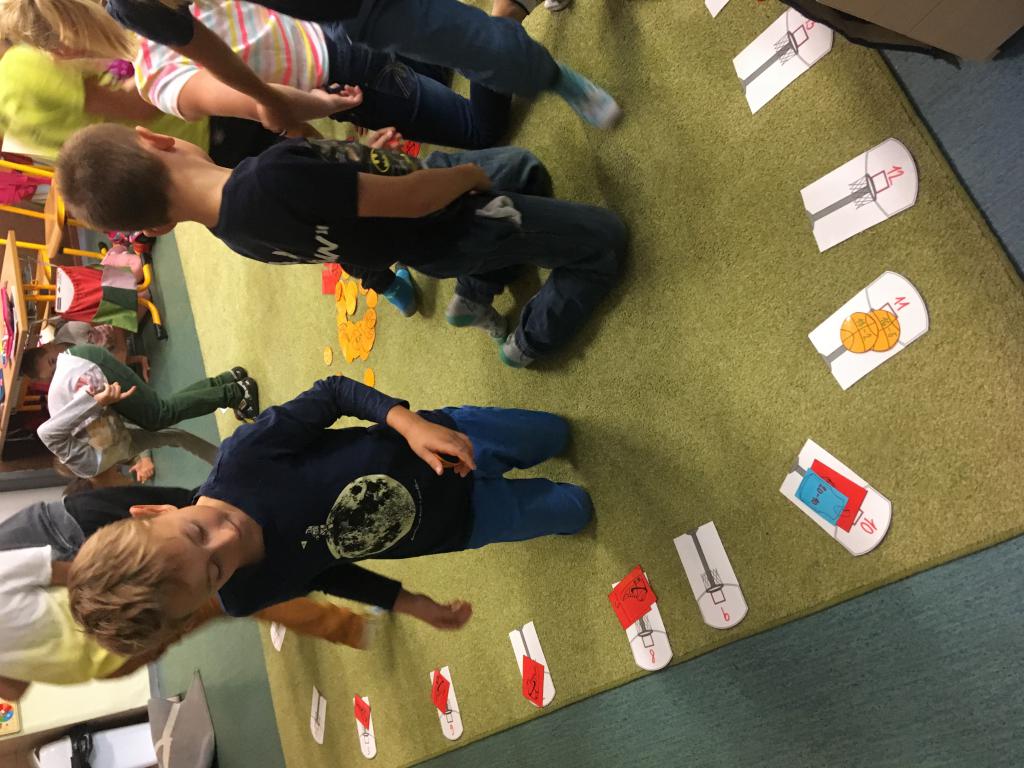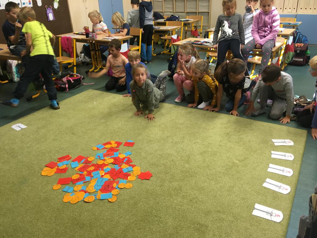 První měsíc je pomalu za námi, před námi dalších devět. :) Opakování učiva z první třídy jsme si zpestřili miniprojektem o uplynulém MS v basketbale. Nejprve jsme zkoušeli v tělocvičně střílet na koš, pak v matematice správně rozřadit míče, tenisky a dresy s příklady ke správným košům s výsledky. Jako v basketu proti sobě hrála dvě družstva. Místo nominace jsme ovšem losovali. :)
