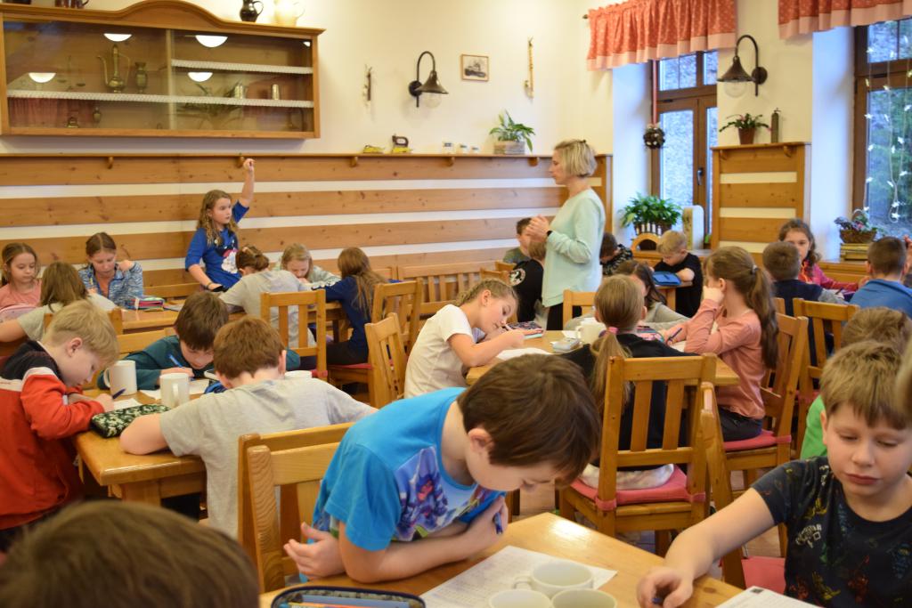 Po přežití prvního dne mimo civilizaci nás čeká tvrdé dopoledne. Ano, bavíme se tu o slohové práci. No co, venku poprchává a zocelování mysli je stejné důležité jako to fyzické. Pravděpodobně zafungoval čerstvý horský vzduch a pěkně nám to odsýpá, za chvíli už nás zachraňuje čas k obědu a přípravy na odpolední expedici.