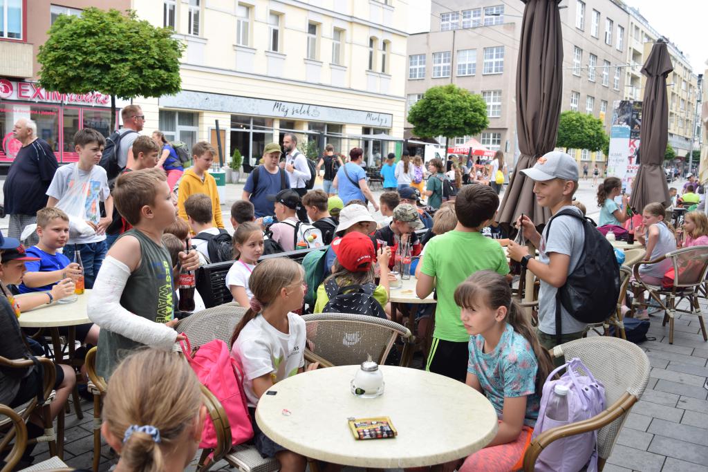 Na dnešní výpravě do města bylo opravdu cítit, že je konec školního roku.Bylo nás všude plno, důchodci byli najednou překvapeni, že třída Míru není v dopoledních hodinách prázdná jako obvykle. Nemůžeme však s jistotou říct, zda byli překvapeni příjemně. Spokojen byl ale určitě pan cukrář, protože jsme nebyli první ani poslední, kdo dnes atakoval jeho novou cukrárnu. Cestou zpět jsme se na Karlovině nezapomněli zmáchat ve fontáně, naštěstí nám díky počasí během cesty do školy vše téměř uschlo.