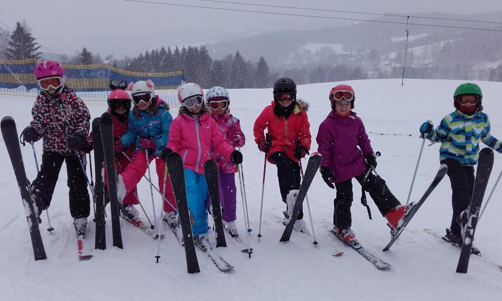 A že prý není sníh :-). To musíte zajet do Olešnice v březnovém termínu. Tam najdete upravenou sjezdovku ozářenou sluníčkem, na které se s chutí prohánějí děti z 1.B, 3.B a 3.A.