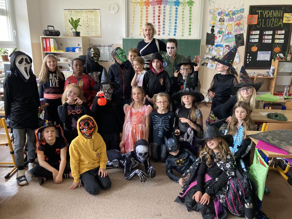 Strašidelný den jsme zahájili už v tělocviku zombie honěnou a fotbálkovým turnajem příšer. Pak jsme se přesunuli na školní zahradu, kde už byla přichystána stezka hrdinů. Z domu č. 49 totiž utekl duch a naším úkolem bylo vyluštit různé úkoly a šifry, které nám daly písmena pro tajné zaklínadlo k otevření magické knihy. Nakonec jsme provedli ještě speciální rituál zmáčknutí měsíce a zlý duch se vrátil zpět do domu.