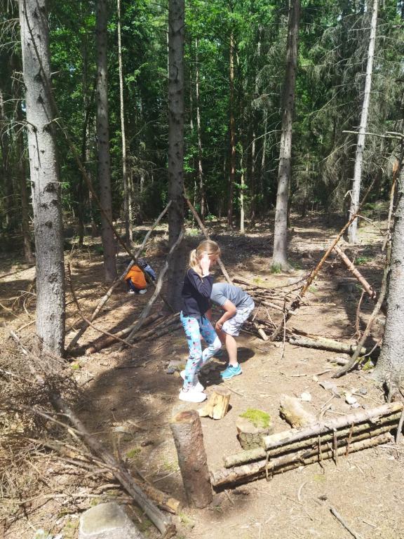 Nesměla chybět ani malá túra a tak jsme odjeli do Slatiňan. Odtud nás zkušení navigátoři vedli po turistických značkách přes zámecký park až na Podhůru. Zahráli jsme si hry, poměřili jsme síly v lesní tělocvičně a Zuzka s paní učitelkou překonaly svůj strach z výšek, když s námi vylezli na rozhlednu Báru.