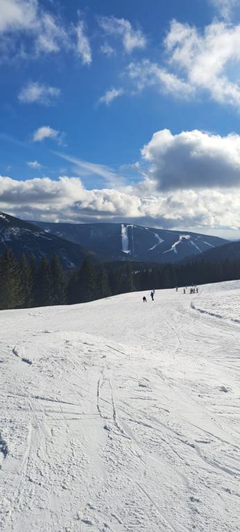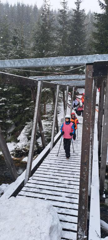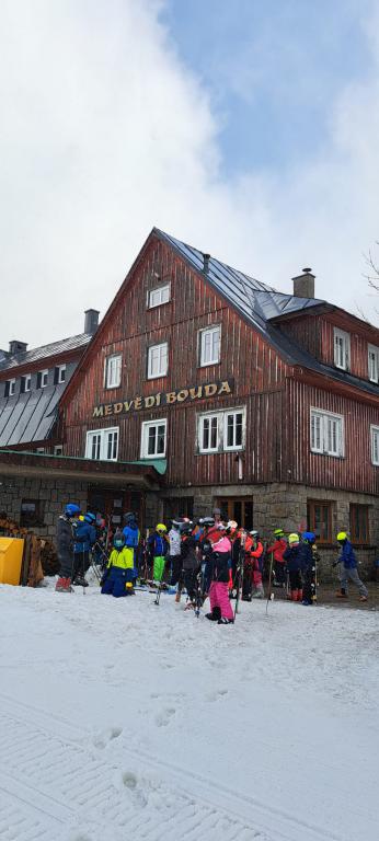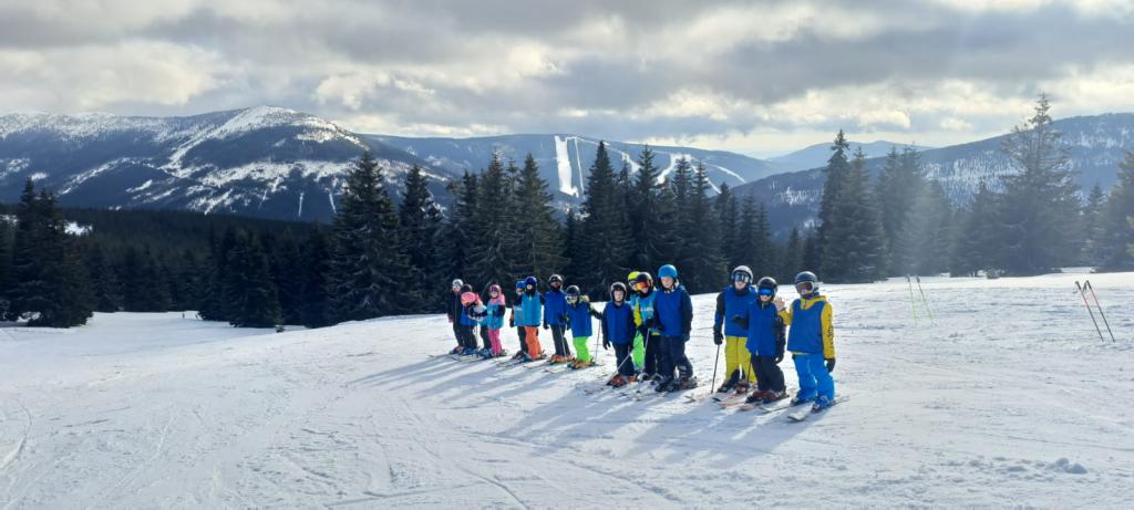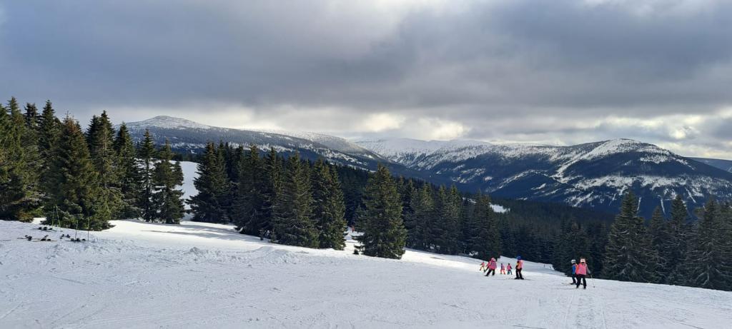 V neděli po obědě jsme vyrazili na lyžáček na Medvědí boudu. Počasí nám moc nepřálo, ale i tak jsme se dostali ještě za světla nahoru. Ubytovali jsme se, navečeřeli a popovídali jsme si, jak bude vše probíhat. Každé ráno nás čekaly křupavé houstičky a spousta dobrot. K tomu, abychom mohli celý týden lyžovat na Davidovkách, nám pomohli vojáci, kteří nám tam dovezli lyže. Pak už stačilo jen dojít na Davidovky a užít si skvělé lyžování. Po pozdnějším obědě nás čekaly běžky. Někdo trénoval u chaty, někdo se vydal na krátký výlet k Brádlerkám. Bylo to moc fajn. Těšíme se na další soustředění.