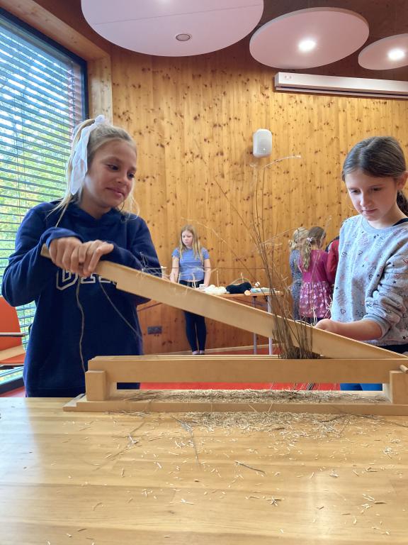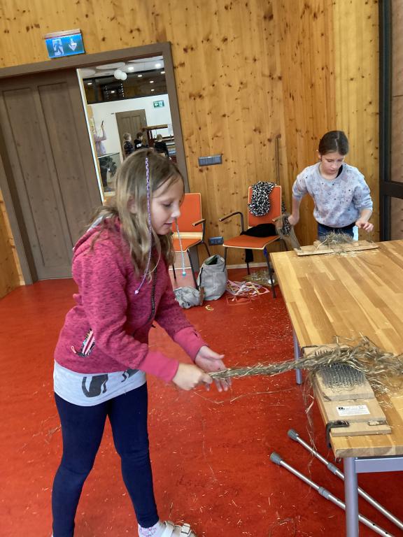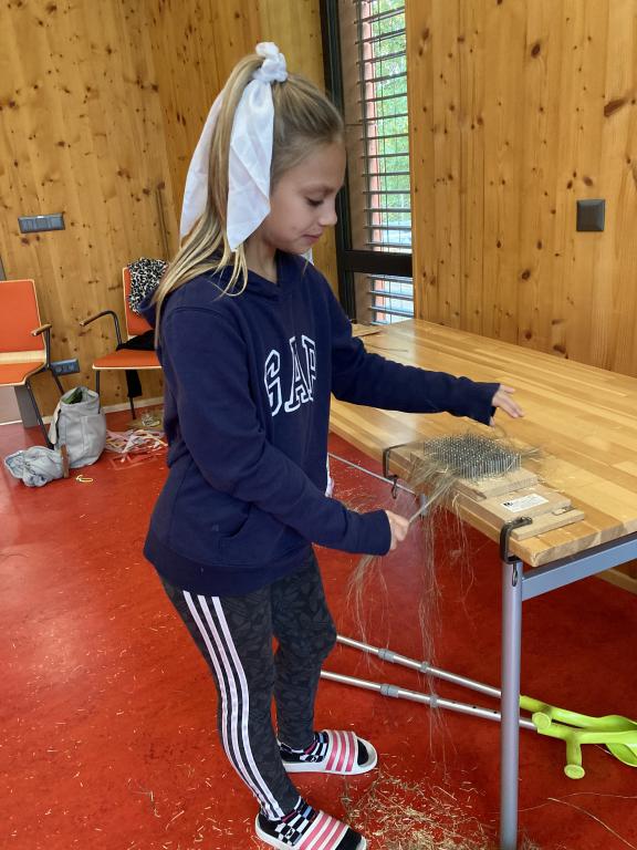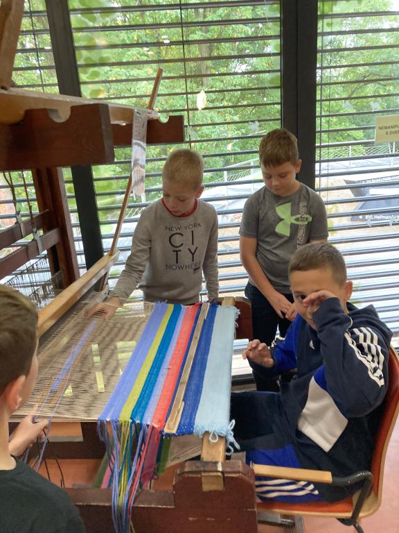 První návštěva Palety ve čtvrté třídě se nesla v duchu Krtečkovy výroby kalhot. Nejprve jsme si celý proces zpracování lnu prošli teoreticky a pak už nám nic nebránilo zkusit to na vlastní kůži. Len jsme nalámali na trdlici, vyčesali na vochli, abychom odstranili pazdeří, a zkusili jsme spříst vlákna na ruční vřeténka. Mnozí z nás se zapotili u tkalcovského stavu a nakonec jsme natiskli barvu na lněné kapesníčky. Odnesli jsme si spoustu nových vědomostí a zkušeností. Takže pokud nevíte co je trdlice a vochle, zkuste se zeptat ve 4.B :)
