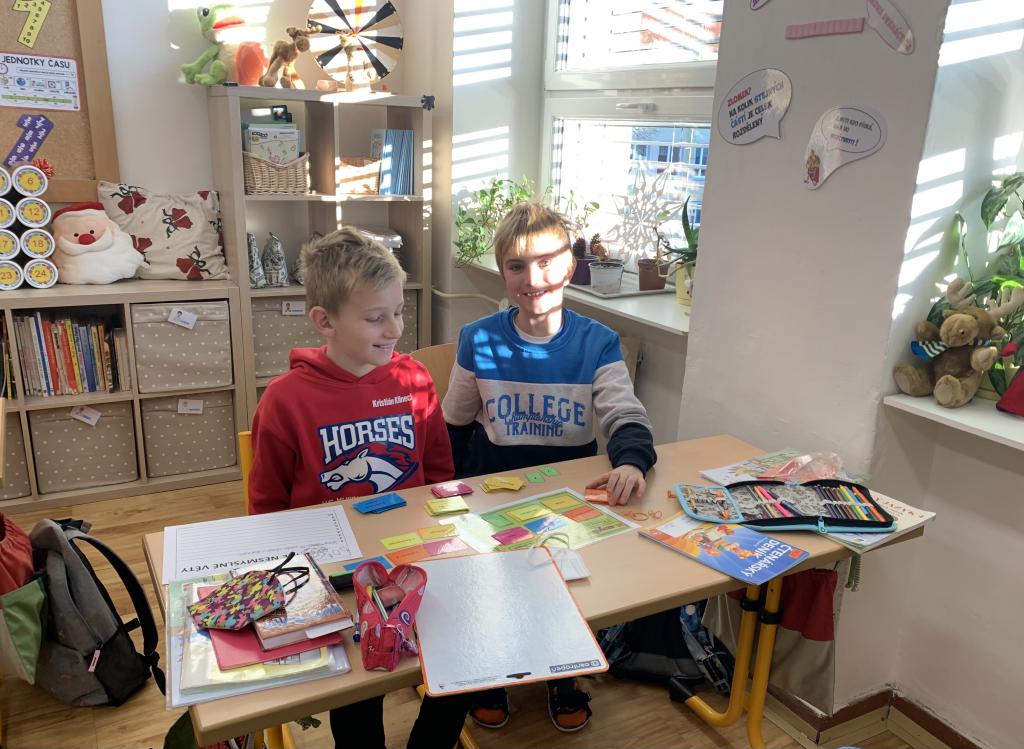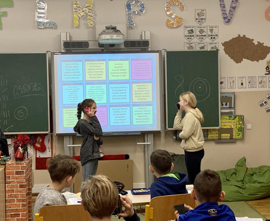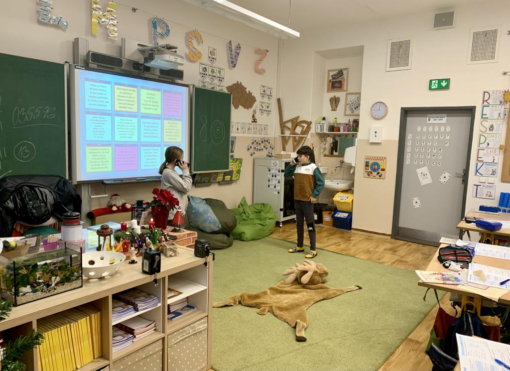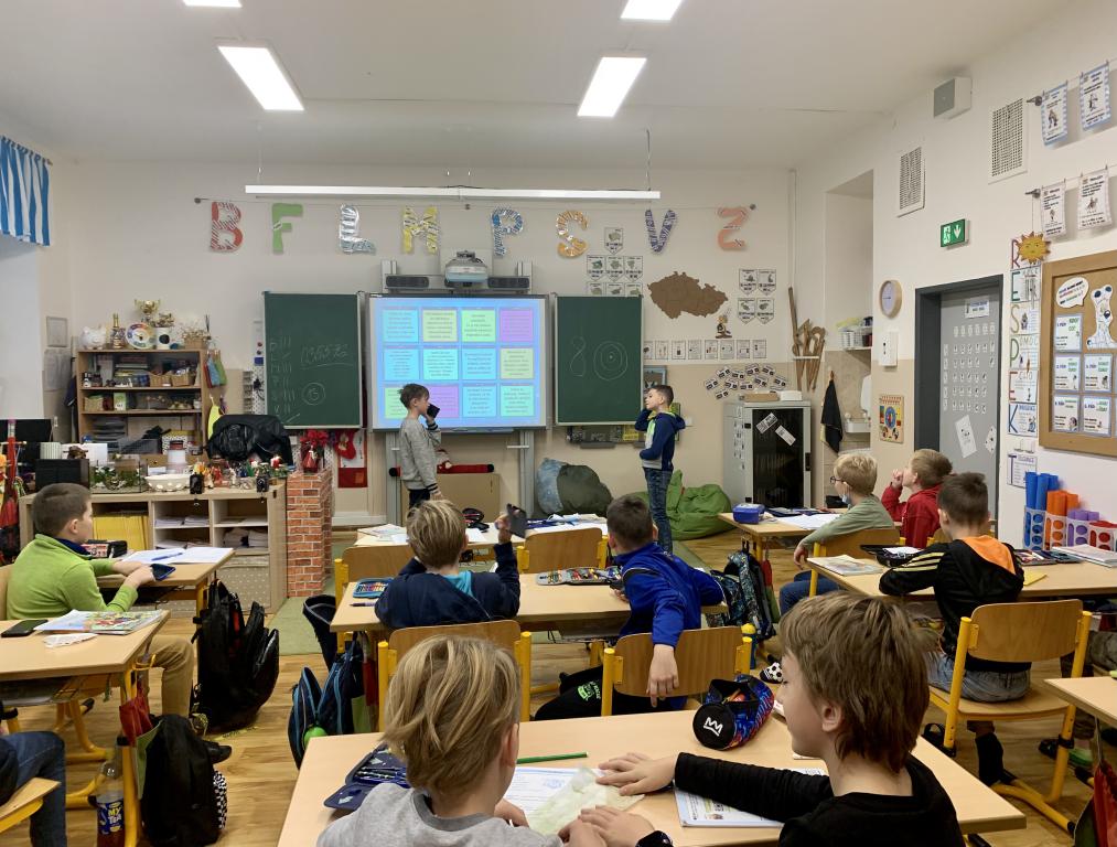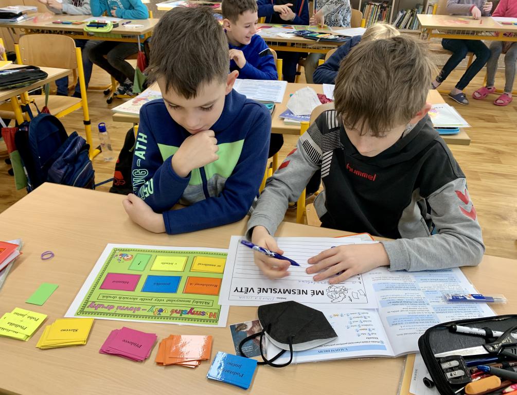 Ve škole jsme si to užili i při vyučování. Hráli jsme hru na telefonování, skládali nesmyslné věty, luštili logické úkoly, ale také psali diktát a opáčko z přírodovědy a doučovali se o 106. Stále opakujeme, procvičujeme a rozšiřujeme již probrané učivo. Ve vlastivědě se už blížíme ke konci vlastivědné části. Na mapě se orientujeme stále lépe a lépe a hádání tajemných míst nás baví.
