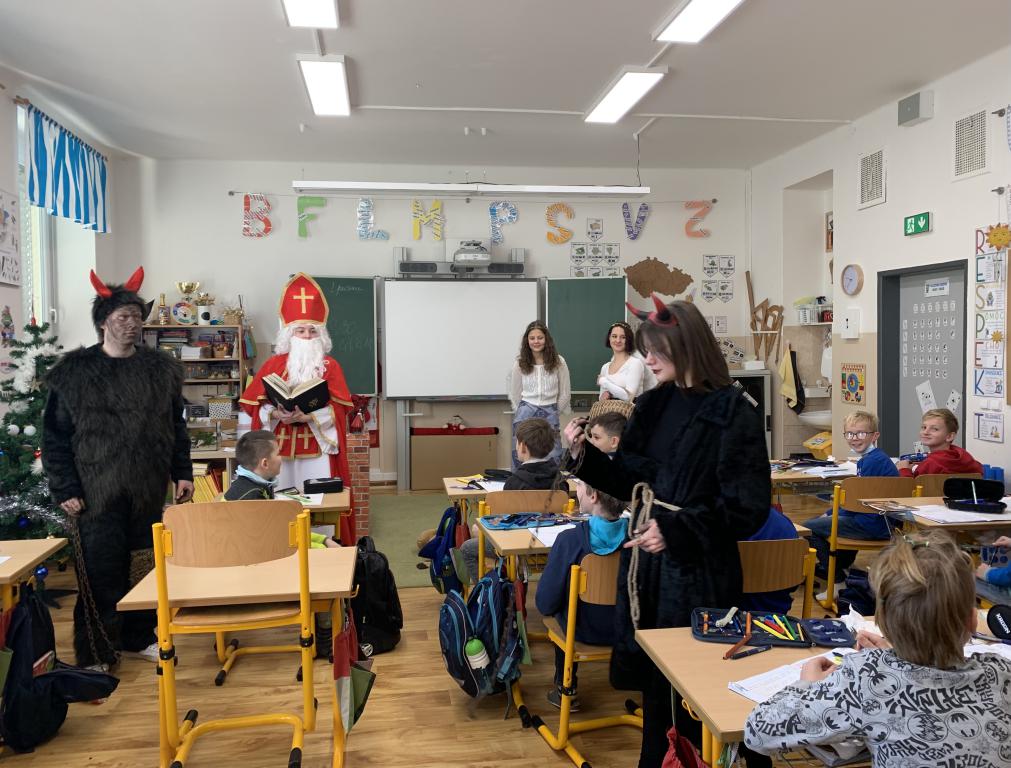 V pátek nás ve třídě nečekaně navštívilo adventní trio Mikuláš, anděl a čet. Obzvlášť ten byl "hustej". Přežili jsme a mohli jsme pak v plném počtu odejít bruslit. Spolu se 3.A a 3.B nás na ledě bylo hodně, ale to nevadí. Klouzat po ledě jsme se učili individuálně a pokroky byly znát. Příští pátek jdeme zas!