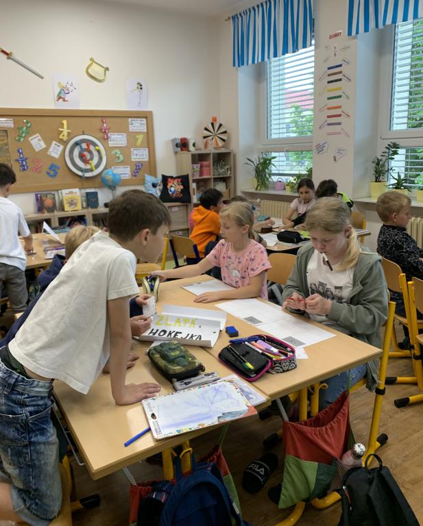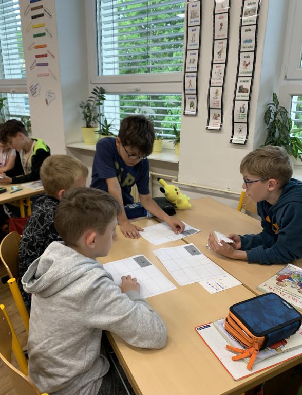 Tento týden byla sousední 4.C na škole v přírodě a ti, kteří neodcestovali na Jurášku, přišli do naší třídy. A tak nás bylo o dva kluky víc. Zahráli jsme si ve dvojicích novu hru "na kočku a na myš", kdy jsme hádali čísla. To bylo bezva. Také jsme kódovali a šifrovali v hodině češtiny. Tajenku jsme rozluštili všichni.