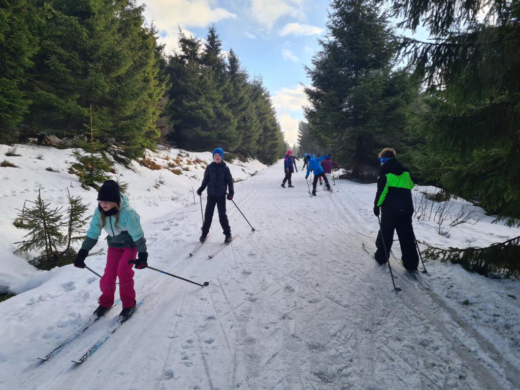 Lyžařský výcvik čtvrťáků proběhl v prostředí Orlických hor u známé Masarykovy chaty na Šerlichu.