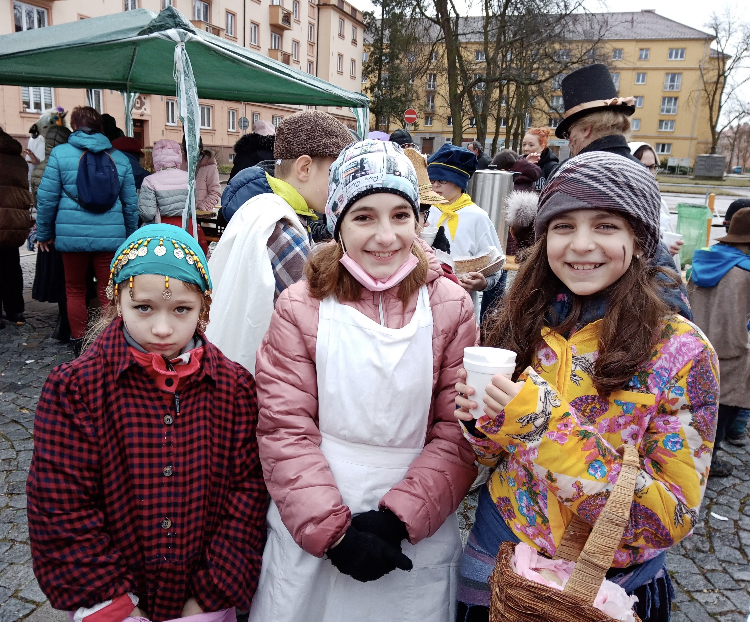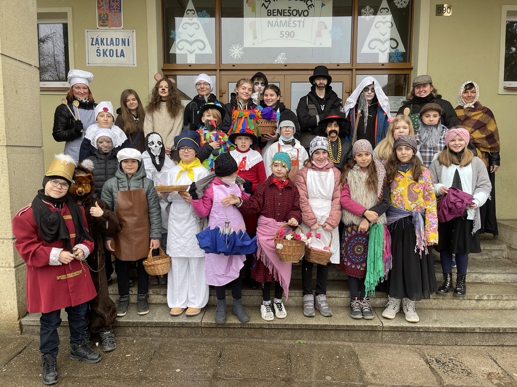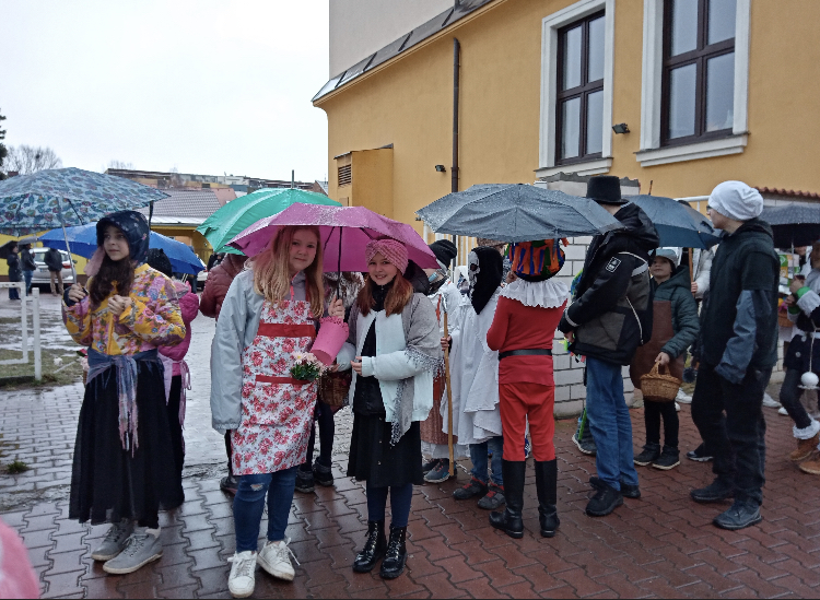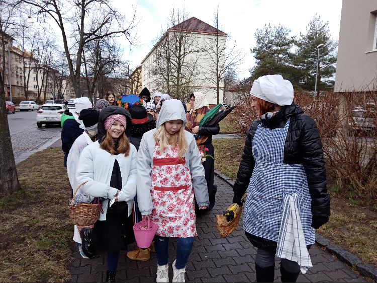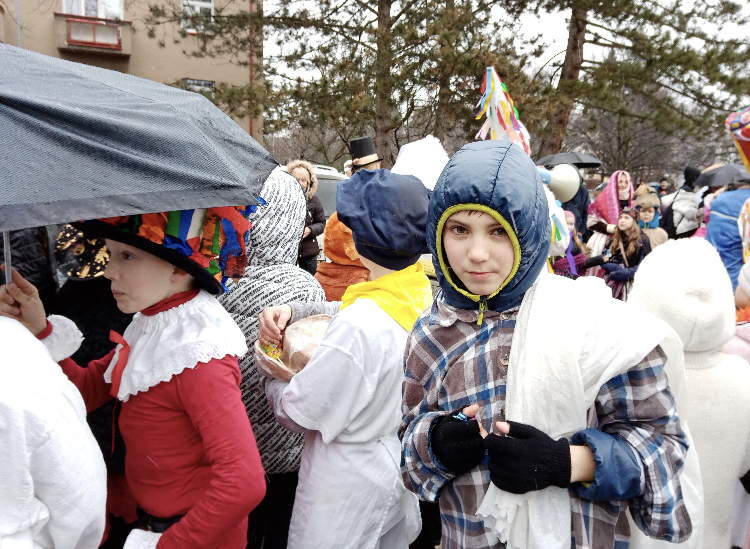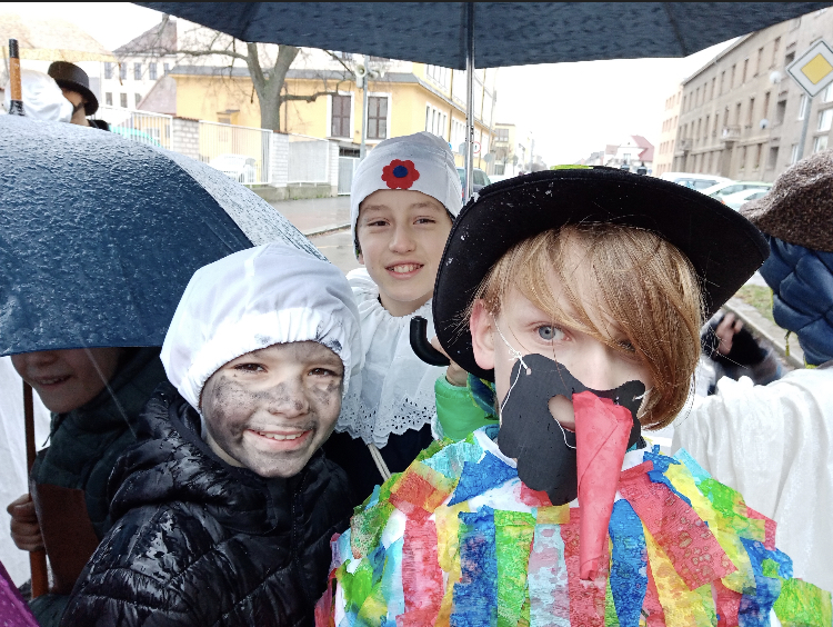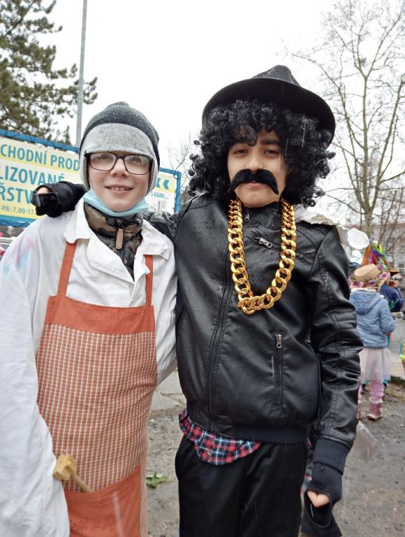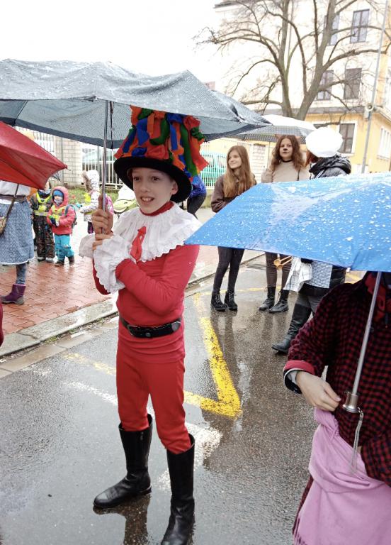 V pátek jsme se sešli všichni v kostýmech. Čekal nás MASOPUSTNÍ PRŮVOD pořádaný městským obvode, kde sídlí naše škola. Těšili jsme se, že bude svítít sluníčko, ale... Počasí nás pěkně "vyšplouchlo", když hned po našem vykročení ze školy začalo nejen pršet, ale i trochu sněžit... Heslo "jaké si to uděláme, takové to máme...." nám není cizí. Ze špatného počasí jsme si nic moc nedělali, ujídali jsme vesele masopustní dobroty, proti zimě jsme tancovali a napájeli se horkým čajem. Další várka telých nápojů nás pak čekala ve škole.