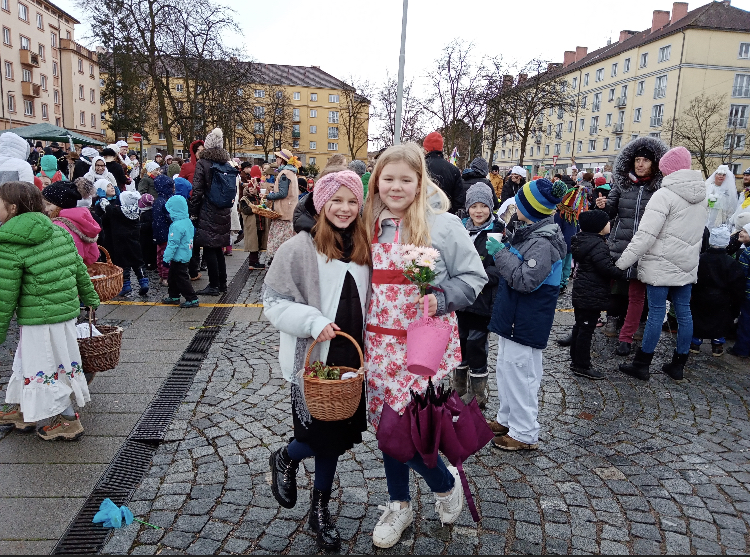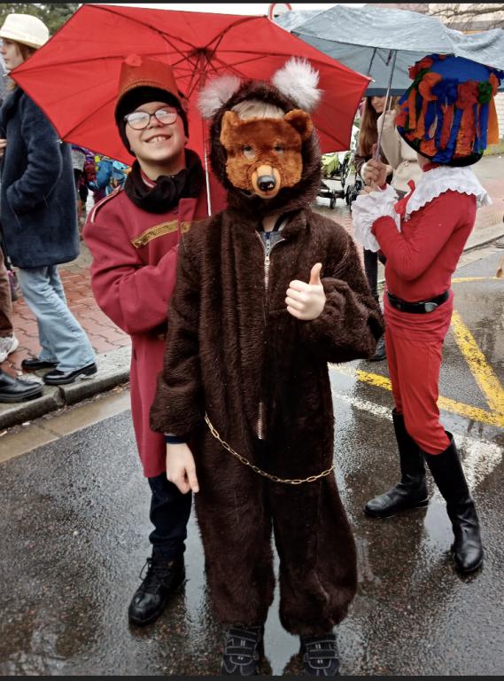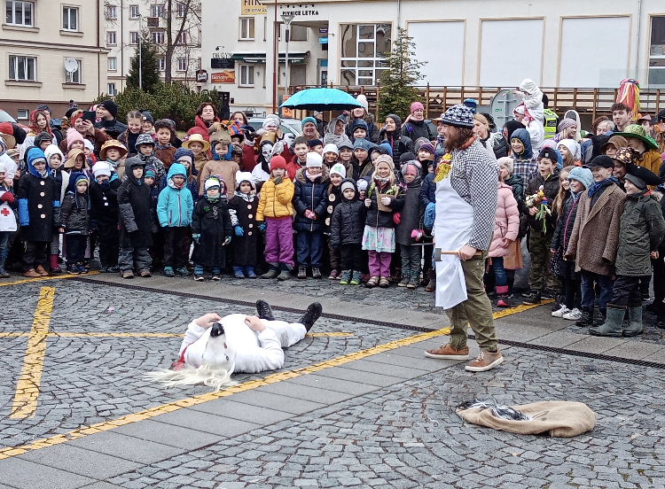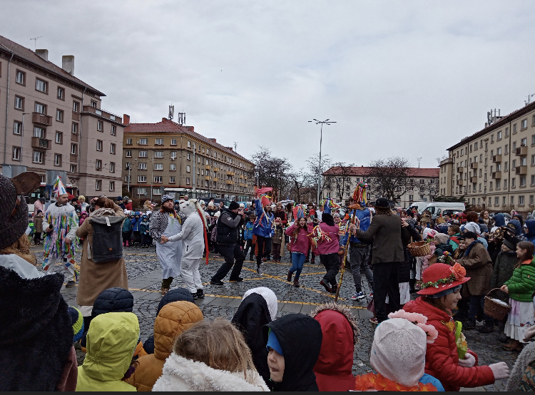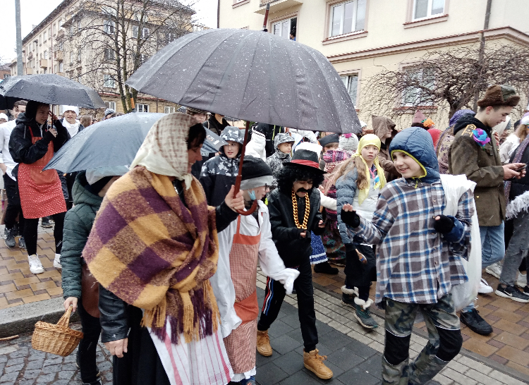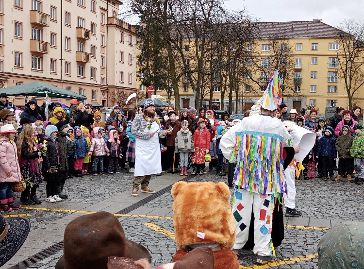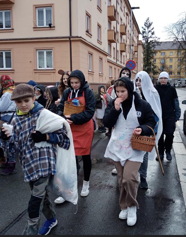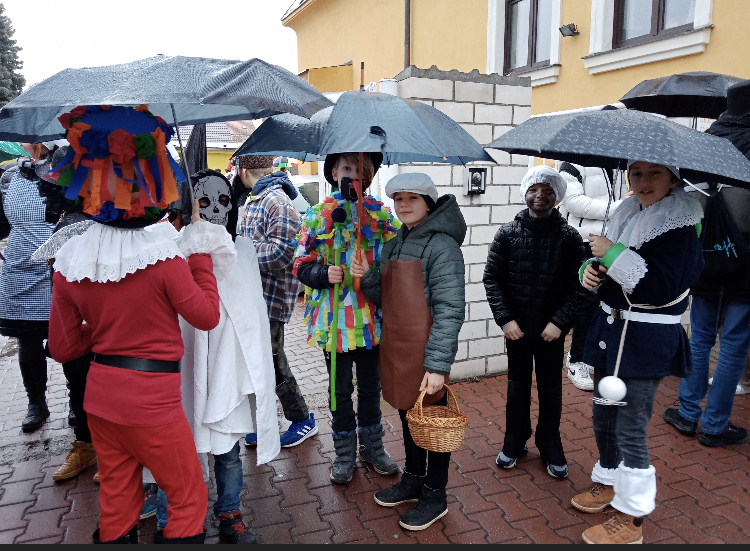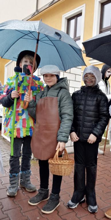 V pátek jsme se sešli všichni v kostýmech. Čekal nás MASOPUSTNÍ PRŮVOD pořádaný městským obvode, kde sídlí naše škola. Těšili jsme se, že bude svítít sluníčko, ale... Počasí nás pěkně "vyšplouchlo", když hned po našem vykročení ze školy začalo nejen pršet, ale i trochu sněžit... Heslo "jaké si to uděláme, takové to máme...." nám není cizí. Ze špatného počasí jsme si nic moc nedělali, ujídali jsme vesele masopustní dobroty, proti zimě jsme tancovali a napájeli se horkým čajem. Další várka telých nápojů nás pak čekala ve škole.