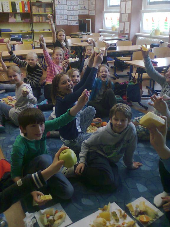 Dnes měly děti možnost ochutnat různé druhy ovoce. Ochutnaly i netradiční, například avokádo, kaki, karambolu, granátové jablko, kumquat, mochyni, nashi, pitahayu. Dozvěděly se informace o jednotlivých druzích ovoce, možnostech jejich použití a zajímavosti o obsahu vitamínů a minerálních látek.
