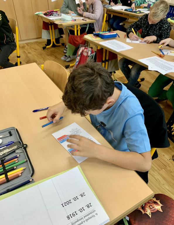 Ne že bychom byli v úterý méně pracovití, ale přeci jen to bylo "o fous" jiné. Dopolední vyučování jsme "věnovali" svátku, který nás čeká 28. října. Je to Den vzniku samostatného československého stálu. Jak to tenkrát bylo nám ukázal český lev v Dějinách udatného národa českého a jak se tento svátek slaví nám pověděli pejsek s kočičkou.