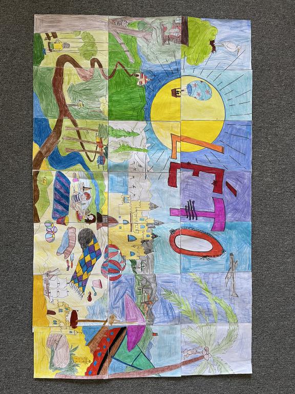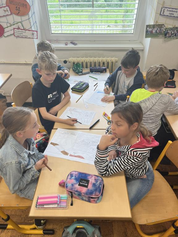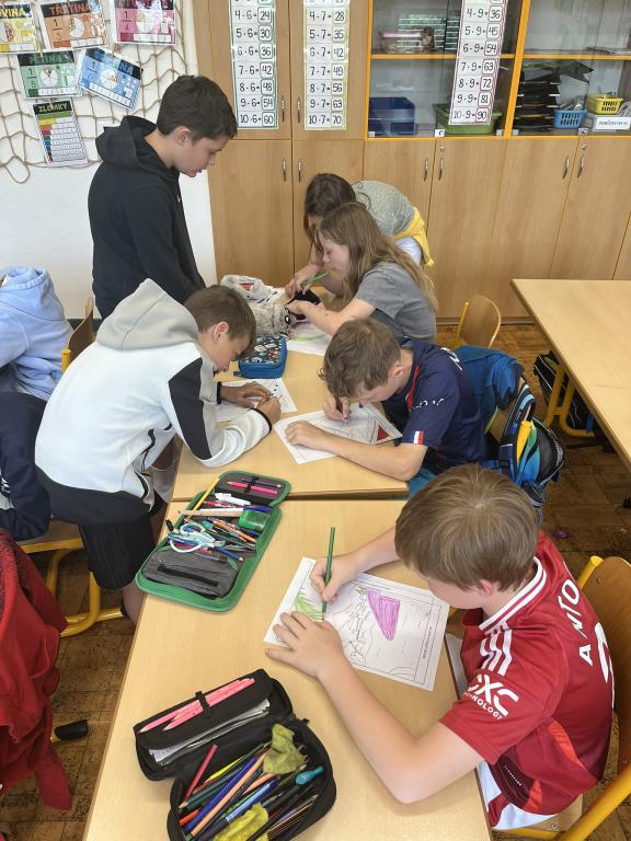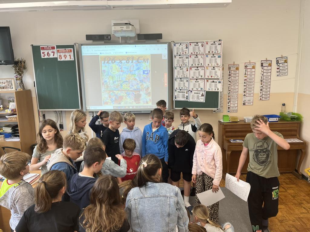 V hodině Výtvarné výchovy jsme společně celá třída malovali jeden obraz! Práce vyžadovala spolupráci mezi námi všemi :). Celý obraz byl rozdělen na 21 jednotlivých obrázků. Po vybarvení malých obrázků jsme je slepili k sobě a vznikl nám jeden celý obraz.