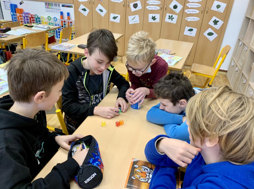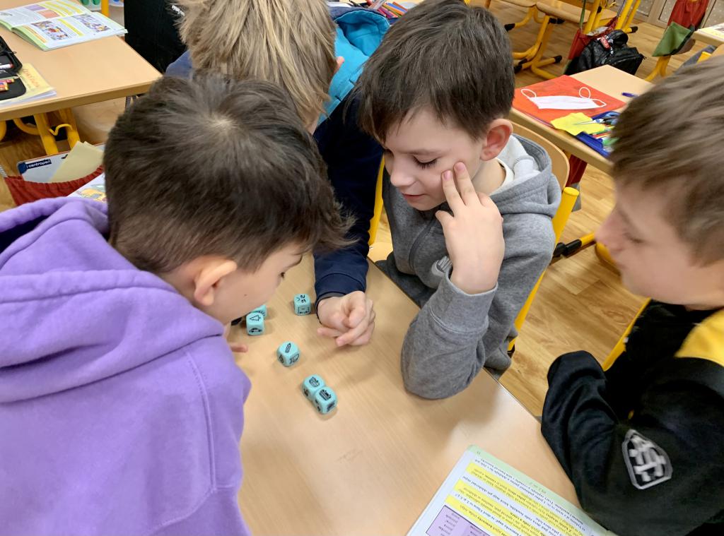 I když tedy je potřeba zmínit, že nám elán do řešení nejrůznějších úkolů nechybí. Teď jsme si oblíbili hru "Hledej slovo", ke které potřebujeme kostku a tiskopis. Házíme, hledáme slova podle souřadnic, zapíšeme do tabulky, vyhrává ten, kdo ji má první celou zaplněnou... Občas to není jednoduché... To tehdy, když se nemůžeme shodnout na správném řešení... ![]()
