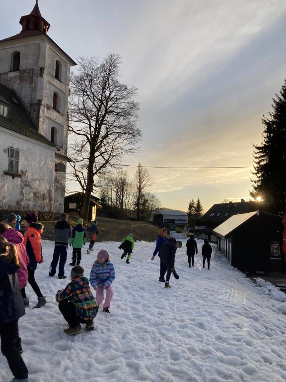 Po obědě a potřebném poledním klidu jsme vyrazili opět ven. Poznávali jsme okolí penzionu Pod sjezdovkou, kde jsme byli ubytovaní. Také jsme hráli celou řadu týmových her a nechyběla ani koulovačka, ve které chrabře bojovali učitelé a trenéři proti velké přesile dětí.
