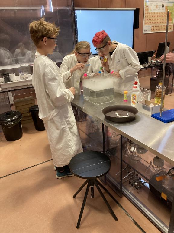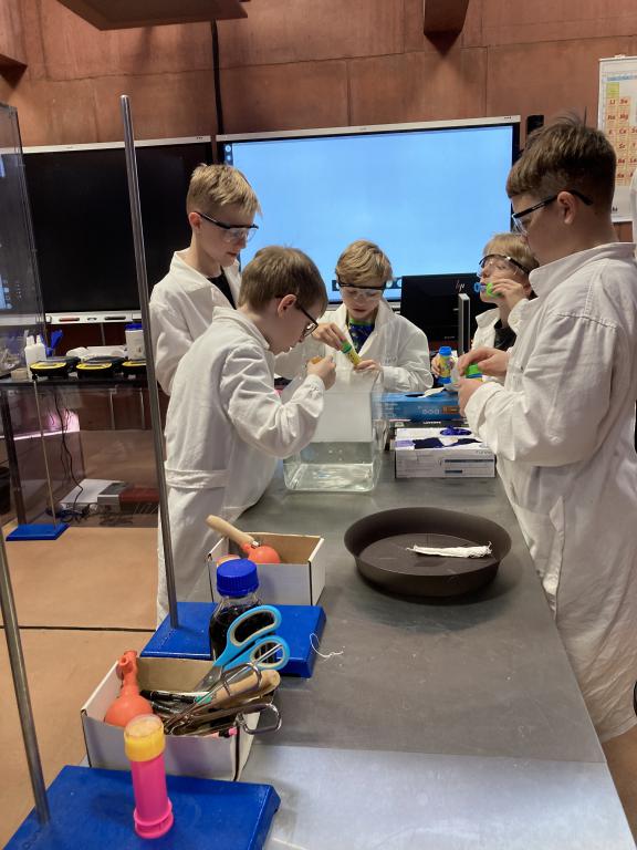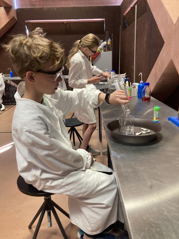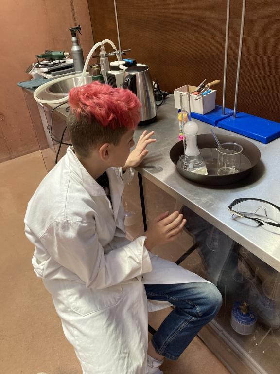Poslední dubnový den jsme zatoužili po vědecké kariéře a tak jsme vyrazili do centra Sféra v Automatických mlýnech. Přístup byl vskutku profesionální, oblékli jsme si bílé pláště a nasadili si ochranné brýle, protože člověk nikdy neví, co se v laboratoři stane. Místní chemik nás provedl světem bublin – vytvářeli jsme bubliny nafouknuté suchým ledem, tančící bublinky v mraku, sopku chrlící lávu i sloní zubní pastu. Spoustu věcí jsme si zkusili i my sami, čímž jsme získali základní laboratorní dovednosti.