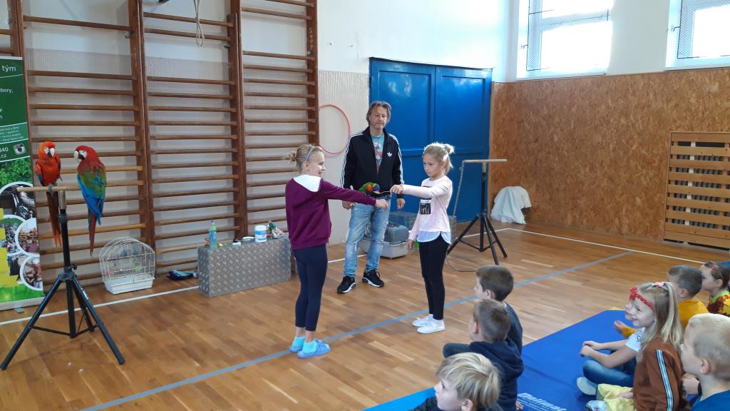 V říjnu jsme do školy pozvali p. Jareše s papoušky. Děti se mohly s papoušky vyfotit a pohladit si je. Papoušky nám představili a dozvěděli jsme se i pár informací z jejich života. Papoušci předvedli přímo cirkusovou show. Točili se na kruhu, nechali se od Natálky a Anetky krmit na lžíci, balancovali na tyči a jiné kousky. Představení bylo naučné a veselé, dětem se moc líbilo.