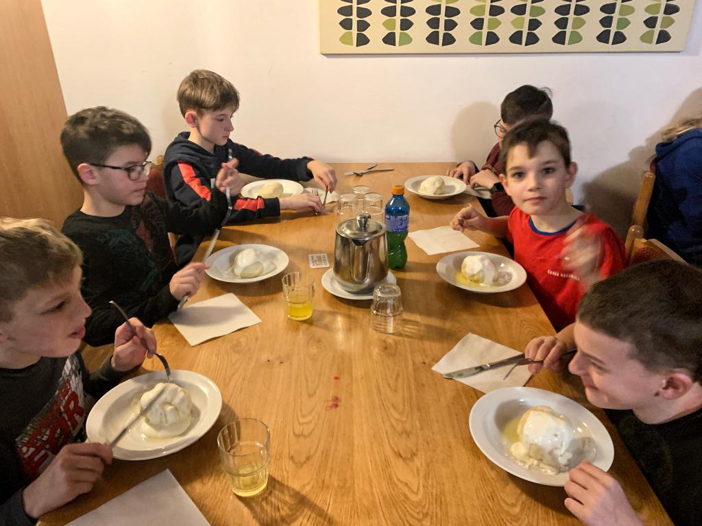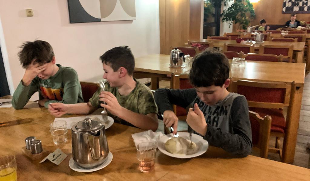 K večeři nás čekaly obří kynuté meruňkové knedlíky a ještě navíc sladká odměna za odvedený výkon.Před druhou večeří jsme si zabalili lyže a lyžáky a po ní dobalili kufry, připravili oblečení na zítřejší běžkařské závody a na odjezd domů. Chvíli jsme u toho řádili, ale pak nás nakonec přemohla únava a všichni jsme brzy usnuli ve svých hotelových postelích. Osud Hanče a Vrbaty se nám tedy dnes vyhnul. ![]()