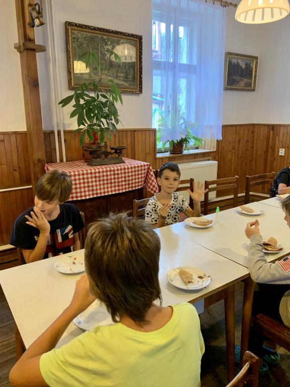 Včerejší déšť je minulostí a počasí na objednávku pokračuje. Parádní den začal parádní snídaní. Na každého z nás čekaly na talíři tři přepychové palačinky! Víte, jak dlouho všech 150 lívanců paní Kobrová připraví? Maximálně za hodinu a čtvrt už nemá co dělat... včetně namazání nutelou či marmeládou, pocukrování a naservírování... Baštili jsme, až jsme měli boule za ušima.