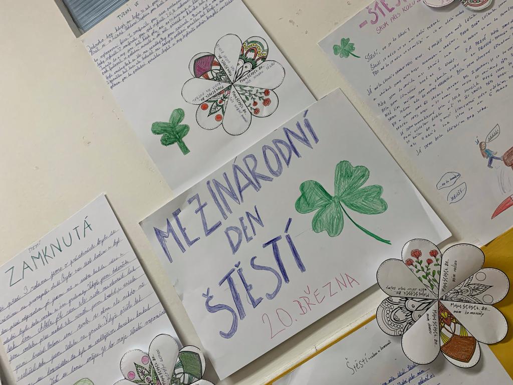 Mezinárodní den štěstí se slaví od roku 2012 z popudu OSN po celém světe 20. března. Proč? Cílem je přimět lidi na celém světě, aby si uvědomili, že je štěstí v našich životech důležité. My v našem áčku jsme si na toto téma napsali "slohovku". Téma vyprávění si zasloužilo nejen písemné, ale i výtvarné zpracování. Do čtyřlístku jsme pak vpisovali, které čtyři věci nás dělají sťastné.