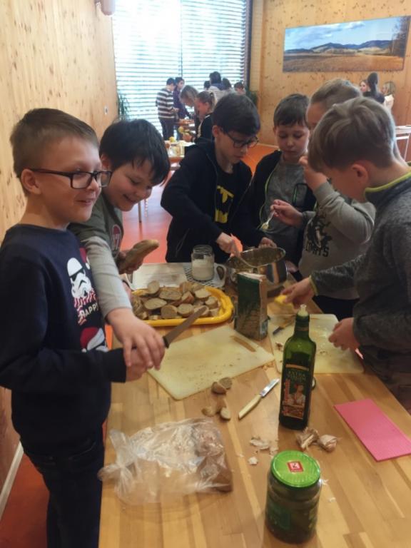 Měsíc duben začal u nás ve třídě velmi pestře. Po úspěšném velikonočním jarmarku nás čekal v pondělí zajímavý program na Paletě - Zdraví na talíři. Děti si ve skupinkách vyzkoušely připravit zdravá jídla. Pracovaly týmově a šikovně připravily zdravé pokrmy: ovocný salát, pomazánku z červené čočky, ovocný čaj a jahelné kuličky. Nakonec jsme všichni ochutnávali a spokojeně jsme se vraceli do školy s pocitem, že jsme něco udělali pro své zdraví.