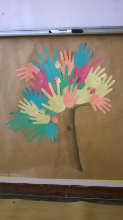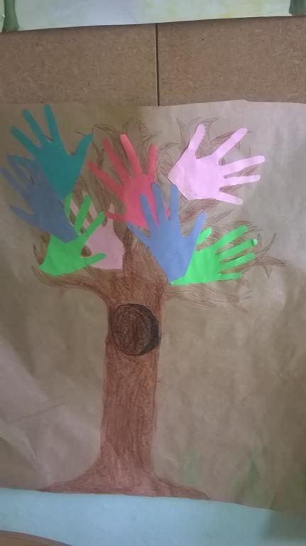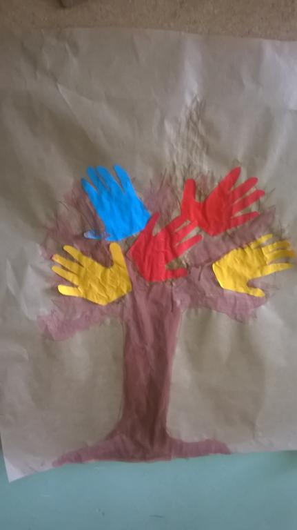 Třetí týden byl věnován opět tvaru rukou, ruce jsme obkreslovali na barevné papíry, vytřihovali a lepili je do tvaru koruny stromů. Vnikl úžasný les rukou, kterými jsou vyzdobeny třídy.
